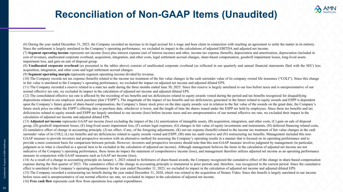 Reconciliation of Non-GAAP Items (Unaudited) C o n fi d e n ti a l. P ro p e rt y o f A M N H e a lt h ca re . 33 (6) During the year ended December 31, 2023, the Company recorded an increase to its legal accrual for a wage and hour claim in connection with reaching an agreement to settle the matter in its entirety. Since the settlement is largely unrelated to the Company’s operating performance, we excluded its impact in the calculations of adjusted EBITDA and adjusted net income. (7) Segment operating income represents net income (loss) plus interest expense (net of interest income) and other, income tax expense (benefit), depreciation and amortization, depreciation (included in cost of revenue), unallocated corporate overhead, acquisition, integration, and other costs, legal settlement accrual changes, share-based compensation, goodwill impairment losses, long-lived assets impairment loss, and gain on sale of disposal group. (8) Unallocated corporate overhead (as presented in the tables above) consists of unallocated corporate overhead (as reflected in our quarterly and annual financial statements filed with the SEC) less acquisition, integration, and other costs and legal settlement accrual changes. (9) Segment operating margin represents segment operating income divided by revenue. (10) The Company records net tax expense (benefit) related to the income tax treatment of the fair value changes in the cash surrender value of its company owned life insurance (“COLI”). Since this change in fair value is unrelated to the Company’s operating performance, we excluded the impact on adjusted net income and adjusted diluted EPS. (11) The Company recorded a reserve related to a state tax audit during the three months ended June 30, 2025. Since this reserve is largely unrelated to our loss before taxes and is unrepresentative of our normal effective tax rate, we excluded its impact in the calculation of adjusted net income and adjusted diluted EPS. (12) The consolidated effective tax rate is affected by the recording of tax benefits and tax deficiencies related to equity awards vested during the period and tax benefits recognized for disqualifying dispositions related to our employee stock purchase plan (“ESPP”). The magnitude of the impact of tax benefits and tax deficiencies generated in the future related to equity awards and ESPP is dependent upon the Company’s future grants of share-based compensation, the Company’s future stock price on the date equity awards vest in relation to the fair value of the awards on the grant date, the Company’s future stock price on either the ESPP’s offering date or purchase date, whichever is lower, and the length of time the shares issued under the ESPP are held by employees. Since these tax benefits and tax deficiencies related to equity awards and ESPP are largely unrelated to our income (loss) before income taxes and are unrepresentative of our normal effective tax rate, we excluded their impact in the calculation of adjusted net income and adjusted diluted EPS. (13) Adjusted net income represents GAAP net income (loss) excluding the impact of the (A) amortization of intangible assets, (B) acquisition, integration, and other costs, (C) gain on sale of disposal group, (D) goodwill impairment losses, (E) long-lived assets impairment loss, (F) certain legal expenses, (G) changes in fair value of equity investments and instruments, (H) deferred financing related costs, (I) cumulative effect of change in accounting principle, (J) tax effect, if any, of the foregoing adjustments, (K) net tax expense (benefit) related to the income tax treatment of fair value changes in the cash surrender value of its COLI, (L) tax benefits and tax deficiencies related to equity awards vested and ESPP, (M) state tax audit reserve and (N) restructuring tax benefits. Management included this non- GAAP measure to provide investors and prospective investors with an alternative method for assessing the Company’s operating results in a manner that is focused on its operating performance and to provide a more consistent basis for comparison between periods. However, investors and prospective investors should note that this non-GAAP measure involves judgment by management (in particular, judgment as to what is classified as a special item to be excluded in the calculation of adjusted net income). Although management believes the items in the calculation of adjusted net income are not indicative of the Company’s operating performance, these items do impact the statement of comprehensive income (loss), and management therefore utilizes adjusted net income as an operating performance measure in conjunction with GAAP measures such as GAAP net income (loss). (14) As a result of a change in accounting principle on January 1, 2023 related to forfeitures of share-based awards, the Company recognized the cumulative effect of the change in share-based compensation expense during the first quarter of 2023. The cumulative effect of the change in accounting principle is immaterial to prior periods and, therefore, was recognized in the current period. Since the cumulative effect is unrelated to the Company’s operating performance for the year ended December 31, 2023, we excluded its impact in the calculation of adjusted net income and adjusted diluted EPS. (15) The Company recorded a restructuring tax benefit during the year ended December 31, 2020, which was related to the acquisition of Stratus Video. Since this benefit is largely unrelated to our income before taxes and is unrepresentative of our normal effective tax rate, we excluded its impact in the calculation of adjusted net income. (16) Free cash flow represents cash flow from operations less capital expenditures.