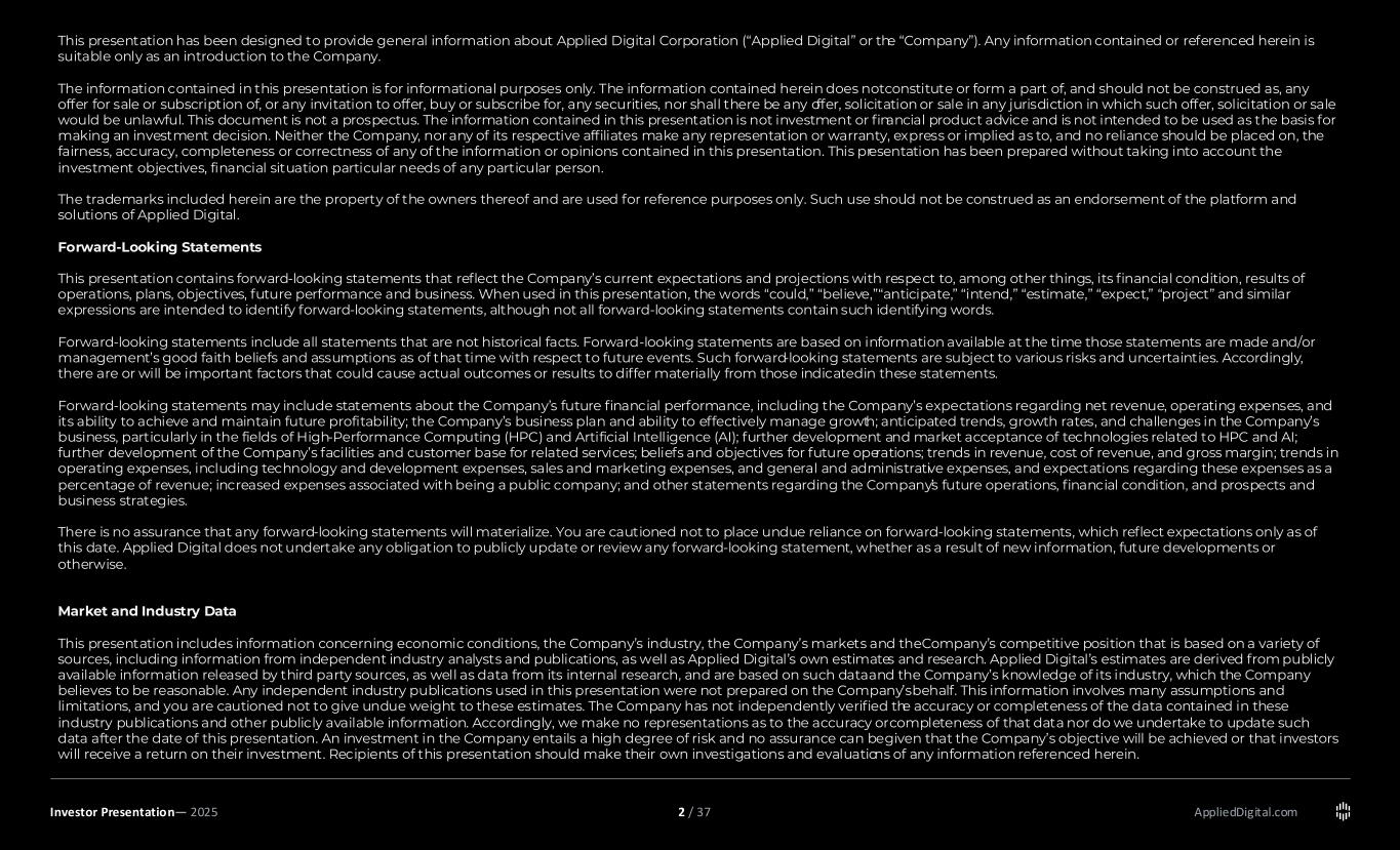 Investor Presentation— 2025 AppliedDigital.com This presentation has been designed to provide general information about Applied Digital Corporation (“Applied Digital” or the “Company”). Any information contained or referenced herein is suitable only as an introduction to the Company.​ The information contained in this presentation is for informational purposes only. The information contained herein does not constitute or form a part of, and should not be construed as, any offer for sale or subscription of, or any invitation to offer, buy or subscribe for, any securities, nor shall there be any offer, solicitation or sale in any jurisdiction in which such offer, solicitation or sale would be unlawful. This document is not a prospectus. The information contained in this presentation is not investment or financial product advice and is not intended to be used as the basis for making an investment decision. Neither the Company, nor any of its respective affiliates make any representation or warranty, express or implied as to, and no reliance should be placed on, the fairness, accuracy, completeness or correctness of any of the information or opinions contained in this presentation. This presentation has been prepared without taking into account the investment objectives, financial situation particular needs of any particular person.​ The trademarks included herein are the property of the owners thereof and are used for reference purposes only. Such use should not be construed as an endorsement of the platform and solutions of Applied Digital.​ Forward-Looking Statements​ This presentation contains forward-looking statements that reflect the Company’s current expectations and projections with respect to, among other things, its financial condition, results of operations, plans, objectives, future performance and business. When used in this presentation, the words “could,” “believe,”“anticipate,” “intend,” “estimate,” “expect,” “project” and similar expressions are intended to identify forward-looking statements, although not all forward-looking statements contain such identifying words. Forward-looking statements include all statements that are not historical facts. Forward-looking statements are based on information available at the time those statements are made and/or management’s good faith beliefs and assumptions as of that time with respect to future events. Such forward-looking statements are subject to various risks and uncertainties. Accordingly, there are or will be important factors that could cause actual outcomes or results to differ materially from those indicated in these statements.​ Forward-looking statements may include statements about the Company’s future financial performance, including the Company’s expectations regarding net revenue, operating expenses, and its ability to achieve and maintain future profitability; the Company’s business plan and ability to effectively manage growth; anticipated trends, growth rates, and challenges in the Company’s business, particularly in the fields of High-Performance Computing (HPC) and Artificial Intelligence (AI); further development and market acceptance of technologies related to HPC and AI; further development of the Company’s facilities and customer base for related services; beliefs and objectives for future operations; trends in revenue, cost of revenue, and gross margin; trends in operating expenses, including technology and development expenses, sales and marketing expenses, and general and administrative expenses, and expectations regarding these expenses as a percentage of revenue; increased expenses associated with being a public company; and other statements regarding the Company’s future operations, financial condition, and prospects and business strategies.​ There is no assurance that any forward-looking statements will materialize. You are cautioned not to place undue reliance on forward-looking statements, which reflect expectations only as of this date. Applied Digital does not undertake any obligation to publicly update or review any forward-looking statement, whether as a result of new information, future developments or otherwise.​ Market and Industry Data​ This presentation includes information concerning economic conditions, the Company’s industry, the Company’s markets and the Company’s competitive position that is based on a variety of sources, including information from independent industry analysts and publications, as well as Applied Digital’s own estimates and research. Applied Digital’s estimates are derived from publicly available information released by third party sources, as well as data from its internal research, and are based on such dataand the Company’s knowledge of its industry, which the Company believes to be reasonable. Any independent industry publications used in this presentation were not prepared on the Company’sbehalf. This information involves many assumptions and limitations, and you are cautioned not to give undue weight to these estimates. The Company has not independently verified the accuracy or completeness of the data contained in these industry publications and other publicly available information. Accordingly, we make no representations as to the accuracy orcompleteness of that data nor do we undertake to update such data after the date of this presentation. An investment in the Company entails a high degree of risk and no assurance can be given that the Company’s objective will be achieved or that investors will receive a return on their investment. Recipients of this presentation should make their own investigations and evaluations of any information referenced herein.​ 2 / 37
