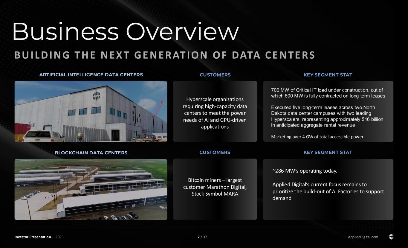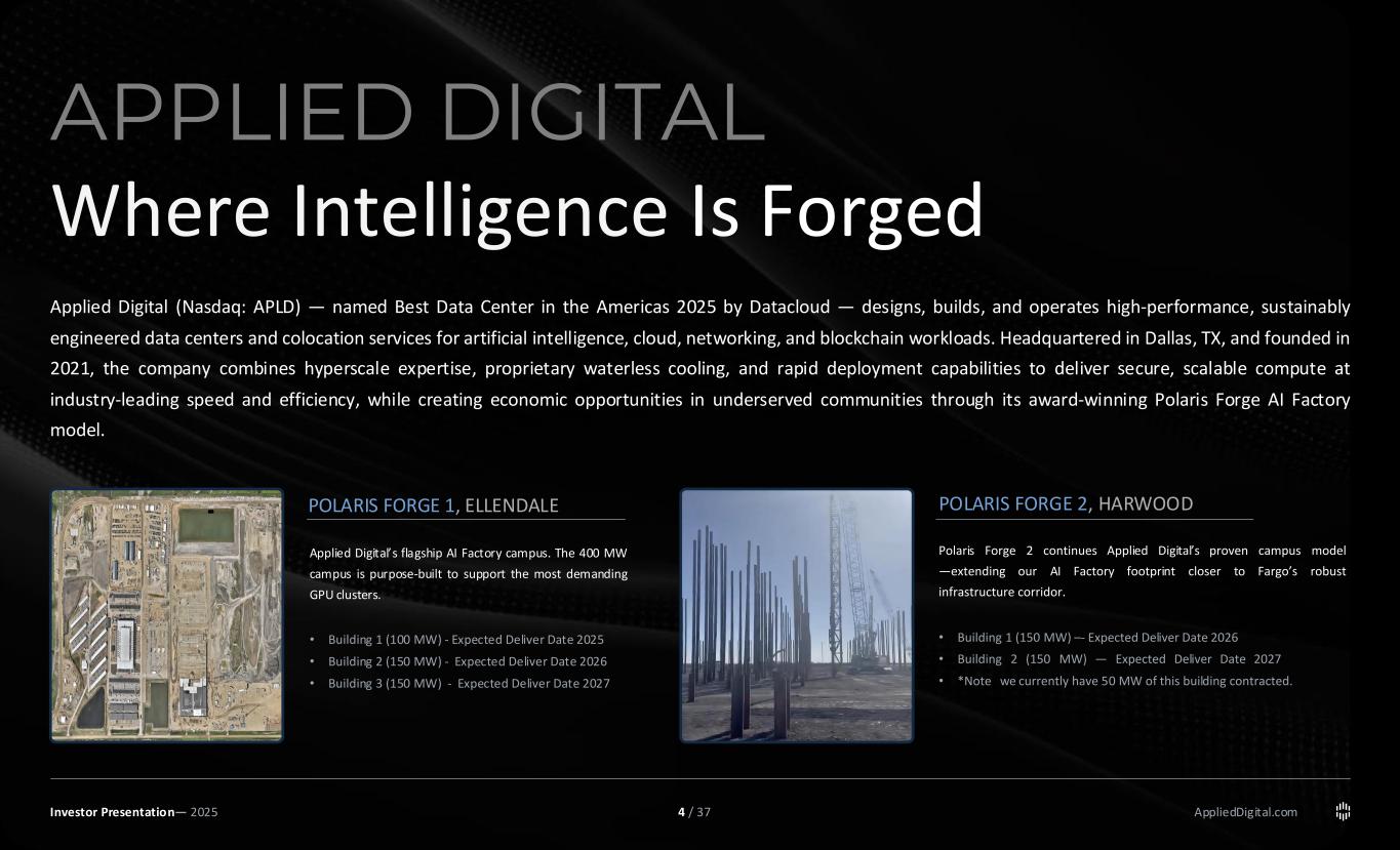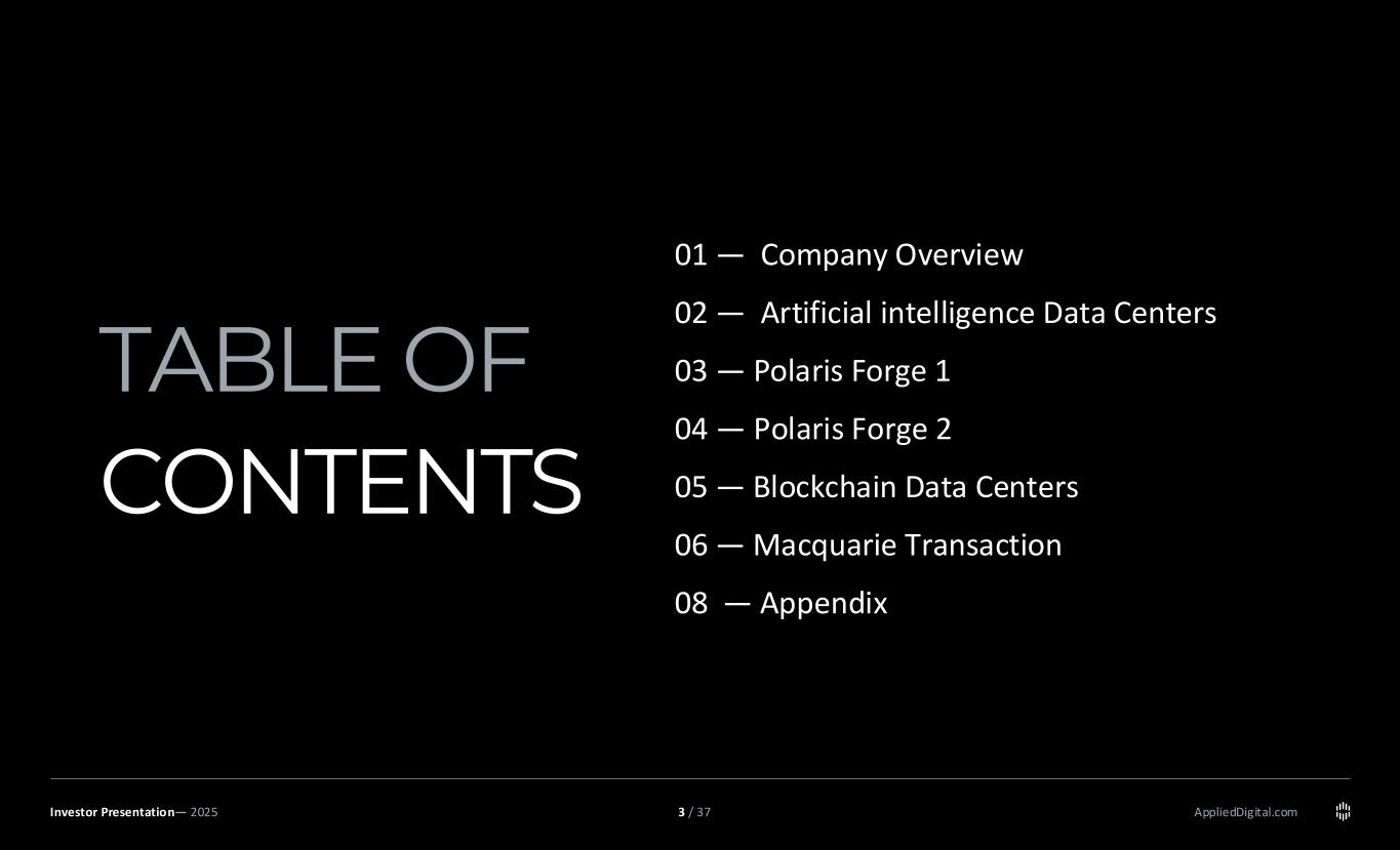 TABLE OF CONTENTS AppliedDigital.com 01 — Company Overview 02 — Artificial intelligence Data Centers 03 — Polaris Forge 1 04 — Polaris Forge 2 05 — Blockchain Data Centers 06 — Macquarie Transaction 08 — Appendix Investor Presentation— 2025 3 / 37