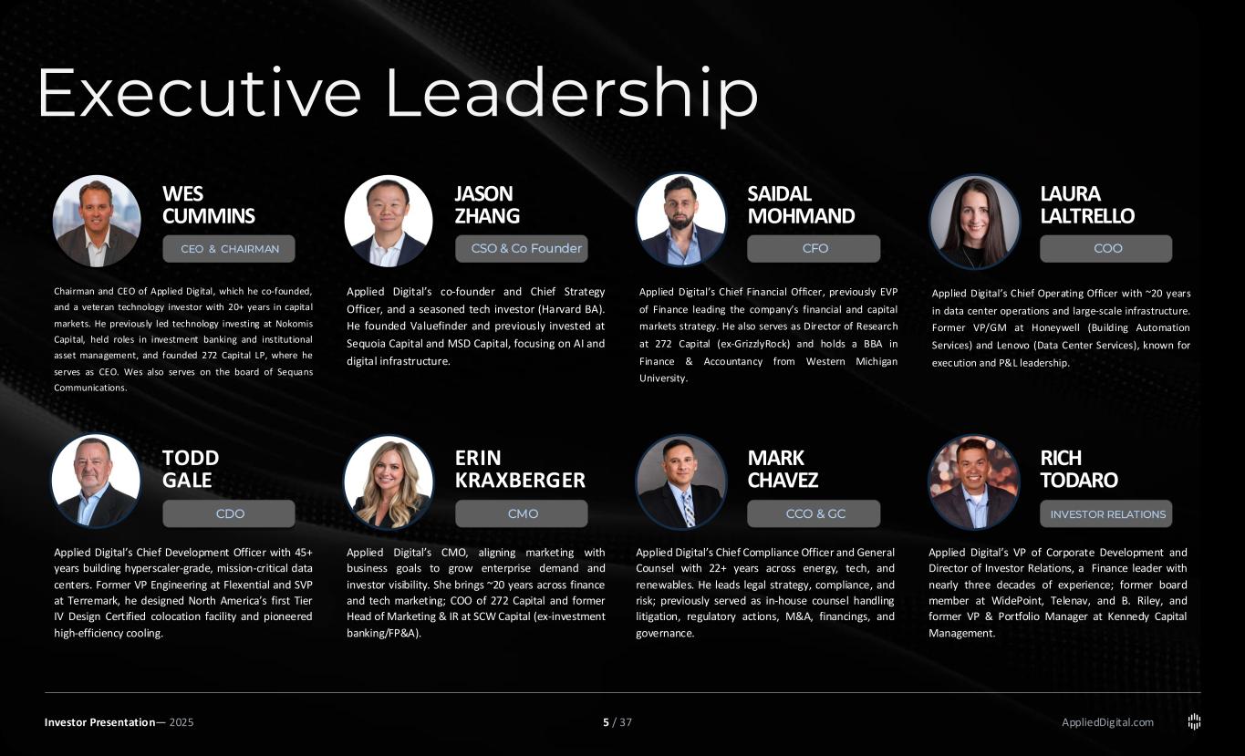 AppliedDigital.com Executive Leadership Investor Presentation— 2025 WES CUMMINS CEO & CHAIRMAN JASON ZHANG CSO & Co Founder Applied Digital’s co-founder and Chief Strategy Officer, and a seasoned tech investor (Harvard BA). He founded Valuefinder and previously invested at Sequoia Capital and MSD Capital, focusing on AI and digital infrastructure. SAIDAL MOHMAND CFO LAURA LALTRELLO COO TODD GALE CDO ERIN KRAXBERGER CMO MARK CHAVEZ CCO & GC RICH TODARO INVESTOR RELATIONS Chairman and CEO of Applied Digital, which he co-founded, and a veteran technology investor with 20+ years in capital markets. He previously led technology investing at Nokomis Capital, held roles in investment banking and institutional asset management, and founded 272 Capital LP, where he serves as CEO. Wes also serves on the board of Sequans Communications. Applied Digital’s Chief Financial Officer, previously EVP of Finance leading the company’s financial and capital markets strategy. He also serves as Director of Research at 272 Capital (ex-GrizzlyRock) and holds a BBA in Finance & Accountancy from Western Michigan University. Applied Digital’s Chief Operating Officer with ~20 years in data center operations and large-scale infrastructure. Former VP/GM at Honeywell (Building Automation Services) and Lenovo (Data Center Services), known for execution and P&L leadership. Applied Digital’s Chief Development Officer with 45+ years building hyperscaler-grade, mission-critical data centers. Former VP Engineering at Flexential and SVP at Terremark, he designed North America’s first Tier IV Design Certified colocation facility and pioneered high-efficiency cooling. Applied Digital’s CMO, aligning marketing with business goals to grow enterprise demand and investor visibility. She brings ~20 years across finance and tech marketing; COO of 272 Capital and former Head of Marketing & IR at SCW Capital (ex-investment banking/FP&A). Applied Digital’s Chief Compliance Officer and General Counsel with 22+ years across energy, tech, and renewables. He leads legal strategy, compliance, and risk; previously served as in-house counsel handling litigation, regulatory actions, M&A, financings, and governance. Applied Digital’s VP of Corporate Development and Director of Investor Relations, a Finance leader with nearly three decades of experience; former board member at WidePoint, Telenav, and B. Riley, and former VP & Portfolio Manager at Kennedy Capital Management. 5 / 37