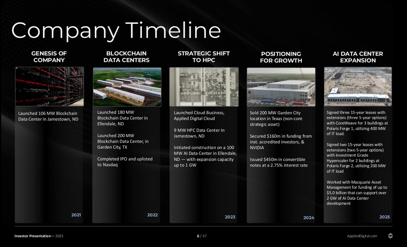 AppliedDigital.comInvestor Presentation— 2025 GENESIS OF COMPANY BLOCKCHAIN DATA CENTERS STRATEGIC SHIFT TO HPC POSITIONING FOR GROWTH AI DATA CENTER EXPANSION Launched 106 MW Blockchain Data Center in Jamestown, ND Launched 180 MW Blockchain Data Center in Ellendale, ND Launched 200 MW Blockchain Data Center, in Garden City, TX Completed IPO and uplisted to Nasdaq Launched Cloud Business, Applied Digital Cloud 9 MW HPC Data Center In Jamestown, ND Initiated construction on a 100 MW AI Data Center in Ellendale, ND — with expansion capacity up to 1 GW Sold 200 MW Garden City location in Texas (non-core strategic asset) Secured $160m in funding from inst. accredited Investors, & NVIDIA Issued $450m in convertible notes at a 2.75% interest rate Signed three 15-year leases with extensions (three 5-year options) with CoreWeave for 3 buildings at Polaris Forge 1, utilizing 400 MW of IT load. Signed two 15-year leases with extensions (two 5-year options) with Investment Grade Hyperscaler for 2 buildings at Polaris Forge 2, utilizing 200 MW of IT load Worked with Macquarie Asset Management for funding of up to $5.0 billion that can support over 2 GW of AI Data Center development Company Timeline 6 / 37