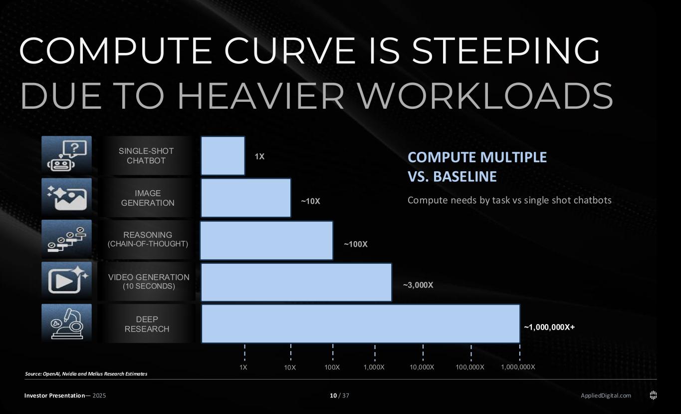 AppliedDigital.comInvestor Presentation— 2025 COMPUTE CURVE IS STEEPING DUE TO HEAVIER WORKLOADS COMPUTE MULTIPLE VS. BASELINE Compute needs by task vs single shot chatbots SINGLE-SHOT CHATBOT IMAGE GENERATION REASONING (CHAIN-OF-THOUGHT) VIDEO GENERATION (10 SECONDS) DEEP RESEARCH 1X 10X 100X 1,000X 10,000X 100,000X 1,000,000X 1X ~10X ~100X ~1,000,000X+ ~3,000X Source: OpenAI, Nvidia and Melius Research Estimates 10 / 37