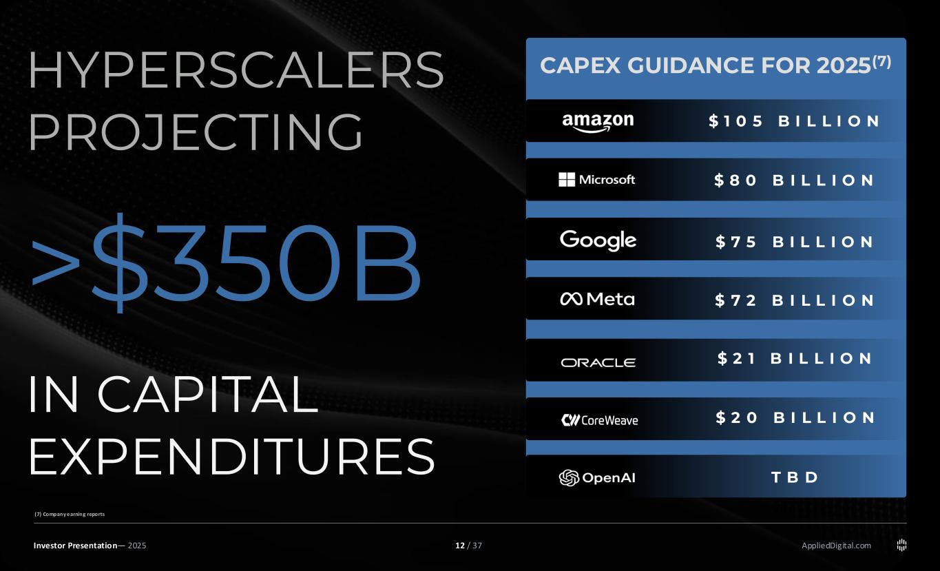 AppliedDigital.com HYPERSCALERS PROJECTING >$350B IN CAPITAL EXPENDITURES Investor Presentation— 2025 (7) Company e arning reports CAPEX GUIDANCE FOR 2025(7) $ 1 0 5 B I L L I O N $ 8 0 B I L L I O N $ 7 5 B I L L I O N $ 7 2 B I L L I O N $ 2 1 B I L L I O N $ 2 0 B I L L I O N T B D 12 / 37
