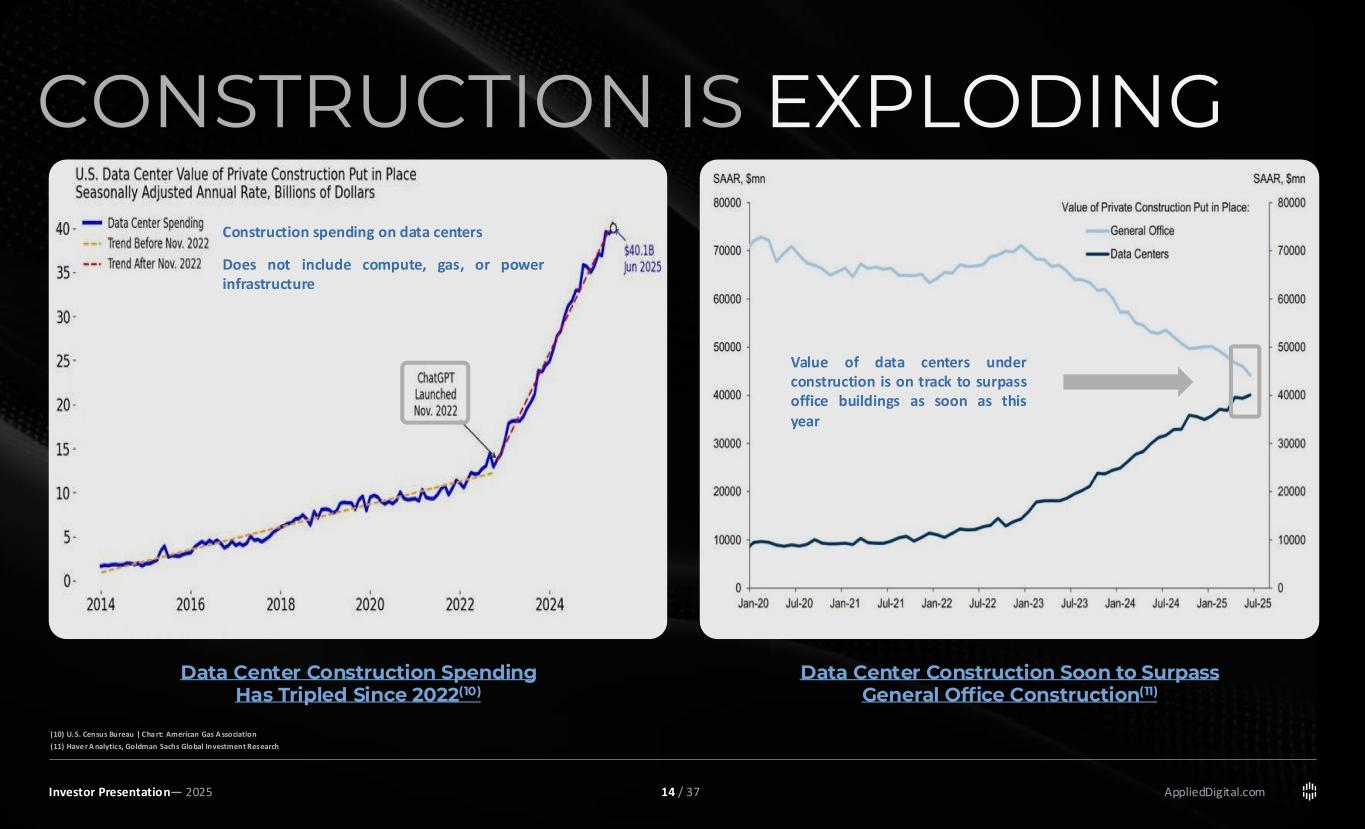 AppliedDigital.comInvestor Presentation— 2025 CONSTRUCTION IS EXPLODING • Boston Consulting Group estimate that the U.S. data center power shortage could exceed 45 GW is projected by 2030(8) • The U.S. Department of Energy (DOE) projects the grid will need 100 GW of new capacity by 2030, with ~50 GW driven by data centers(8) • 1 GW is equivalent to the power output of one nuclear power plant Data Center Construction Spending Has Tripled Since 2022(10) Data Center Construction Soon to Surpass General Office Construction(11) Value of data centers under construction is on track to surpass office buildings as soon as this year Construction spending on data centers Does not include compute, gas, or power infrastructure (10) U.S. Census Bureau | Cha rt: American Gas A ssociation (11) Have r A nalytics, Goldman Sachs Global Investment Research 14 / 37