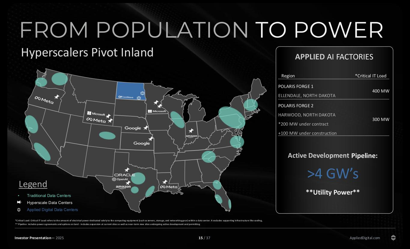 AppliedDigital.com Title AI FACTORIES FROM POPULATION TO POWER Investor Presentation— 2025 Hyperscalers Pivot Inland • Traditional Data Centers • Hyperscale Data Centers • Applied Digital Data Centers POLARIS FORGE 1 ELLENDALE, NORTH DAKOTA 400 MW POLARIS FORGE 2 HARWOOD, NORTH DAKOTA *200 MW under contract +100 MW under construction 300 MW Region *Critical IT Load Pipeline: >4 GW’s **Utility Power** *Critical Load: Critical IT Load refers to the amount of electrical powe r dedicated sole ly to the computing equipme nt (such as servers , stora ge, and netw orking ge ar) w ithin a data center. It excludes supporting infrastructure like cooling, ** Pipeline includes powe r a greements a nd options on land - includes e xpansion at current sites a s well as near-term new sites undergoing active development and permitting Legend 15 / 37