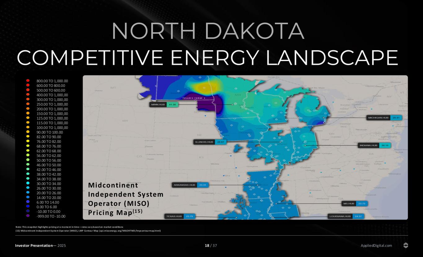 AppliedDigital.com NORTH DAKOTA COMPETITIVE ENERGY LANDSCAPE Investor Presentation— 2025 Note: This snapshot highlights pricing a t a mome nt in time—rates va ry base d on market conditions (15) Midcontinent Independent Syste m Ope rator (MISO), LMP Contour Map (api.misoenergy.org/MISORTWD /lmpcontourmap.html) P O L A R I S F O R G E 1 800.00 TO 1,000.00 600.00 TO 800.00 500.00 TO 600.00 400.00 TO 1,000,00 300.00 TO 1,000,00 250.00 TO 1,000,00 200.00 TO 1,000,00 150.00 TO 1,000,00 125.00 TO 1,000,00 115.00 TO 1,000,00 100.00 TO 1,000,00 90.00 TO 100.00 82.00 TO 90.00 76.00 TO 82.00 68.00 TO 76.00 62.00 TO 68.00 56.00 TO 62.00 50.00 TO 56.00 46.00 TO 50.00 42.00 TO 46.00 38.00 TO 42.00 34.00 TO 38.00 30.00 TO 34.00 26.00 TO 30.00 20.00 TO 26.00 14.00 TO 20.00 6.00 TO 14.00 0.00 TO 6.00 -10.00 TO 0.00 -999.00 TO -10.00 Midcontinent Independent System Operator (MISO) Pr icing Map (1 5 ) 18 / 37