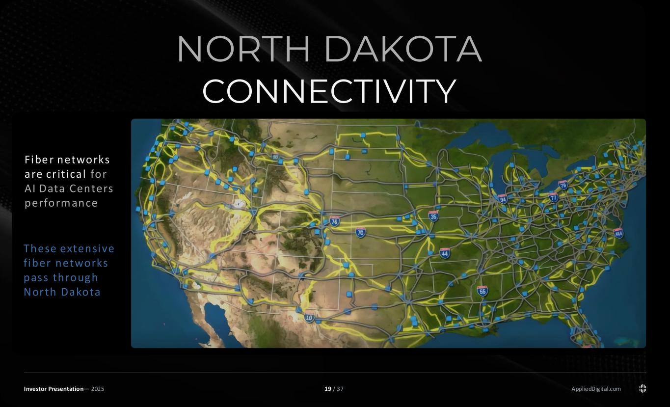 AppliedDigital.com NORTH DAKOTA CONNECTIVITY Investor Presentation— 2025 Fibe r networks are cr itica l for AI Data Centers perform ance These extensive fiber networks pass through North Dakota 19 / 37