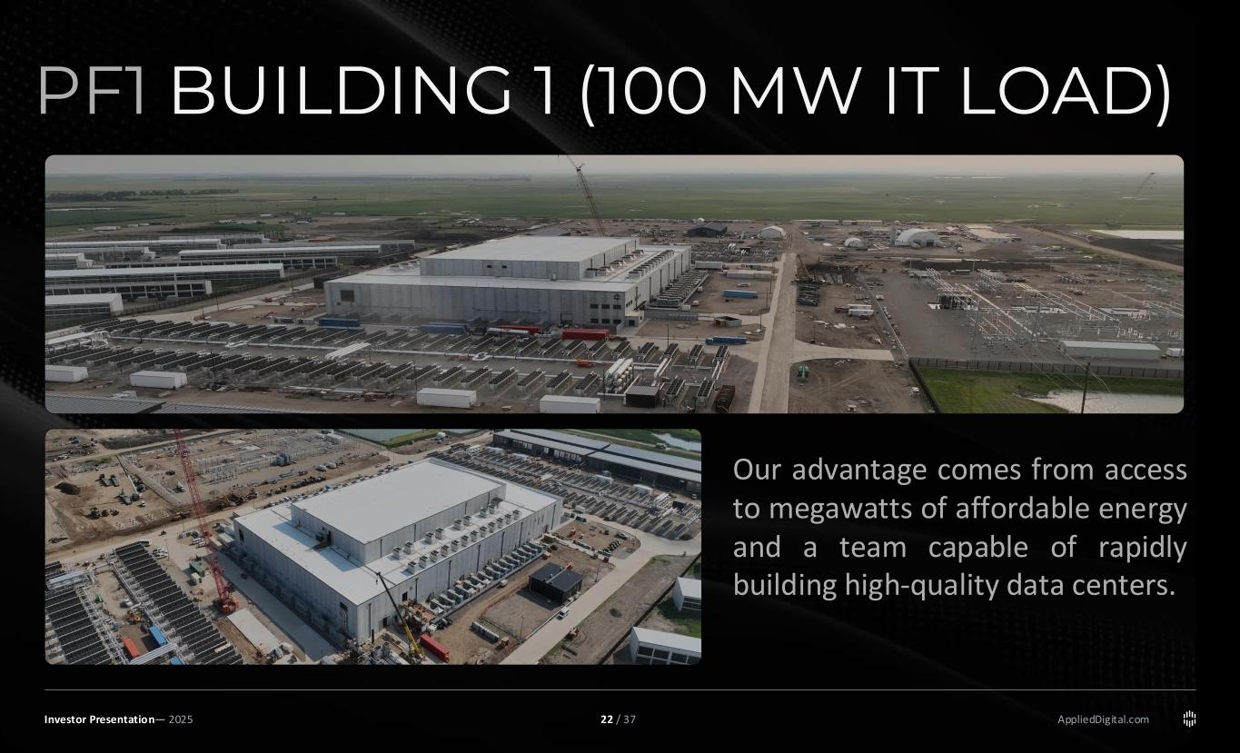 AppliedDigital.com PF1 CAMPUS LAYOUT PF1 BUILDING 1 - 100 MW PF1 BUILDING 2 – 150 MW PF1 BUILDING 3 – 150 MW D ESIG N PUE : ~1.15 ANNUAL AVERAGE CO O LING : CLOSED LOOP LIQUID COOLING o Calendar – 2H 2025 o Calendar – 2H 2026 o Calendar – 1H 2027 Expected Delivery Investor Presentation— 2025 21 / 37