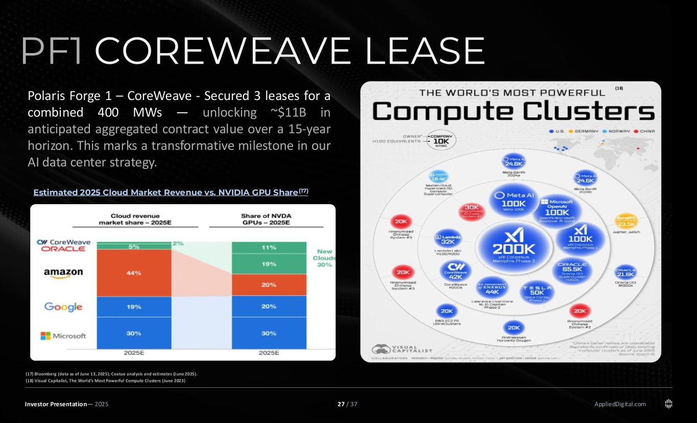 AppliedDigital.com PF1 COREWEAVE LEASE Polaris Forge 1 – CoreWeave - Secured 3 leases for a combined 400 MWs — unlocking ~$11B in anticipated aggregated contract value over a 15-year horizon. This marks a transformative milestone in our AI data center strategy. Estimated 2025 Cloud Market Revenue vs. NVIDIA GPU Share(17) (18) (17) Bloomberg (data as of June 13, 2025); Coatue analysis and estimates (June 2025). (18) Visual Capitalist, The World’s Most Powerful Compute Clusters (June 2023) Investor Presentation— 2025 27 / 37