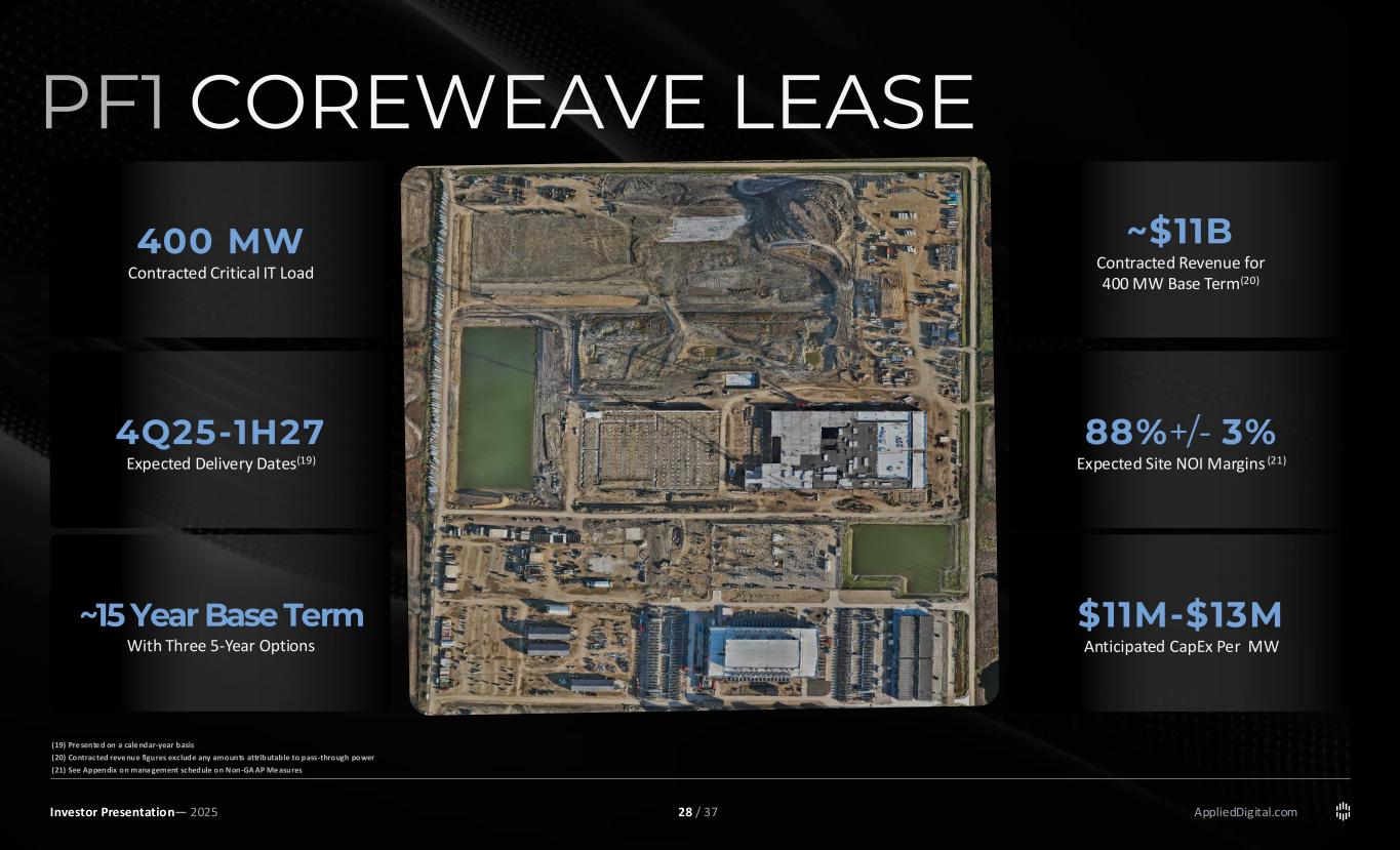 AppliedDigital.com PF1 COREWEAVE LEASE (17) 400 MW Contracted Critical IT Load 4Q25-1H27 Expected Delivery Dates(19) ~15 Year Base Term With Three 5-Year Options ~$11B Contracted Revenue for 400 MW Base Term(20) 88%+/- 3% Expected Site NOI Margins (21) $11M-$13M Anticipated CapEx Per MW (19) Pre sente d on a cale ndar-year basis (20) Contracted reve nue figures exclude any amounts attributable to pass-through power (21) See Appendix on mana gement schedule on Non-GA AP Me asures Investor Presentation— 2025 28 / 37