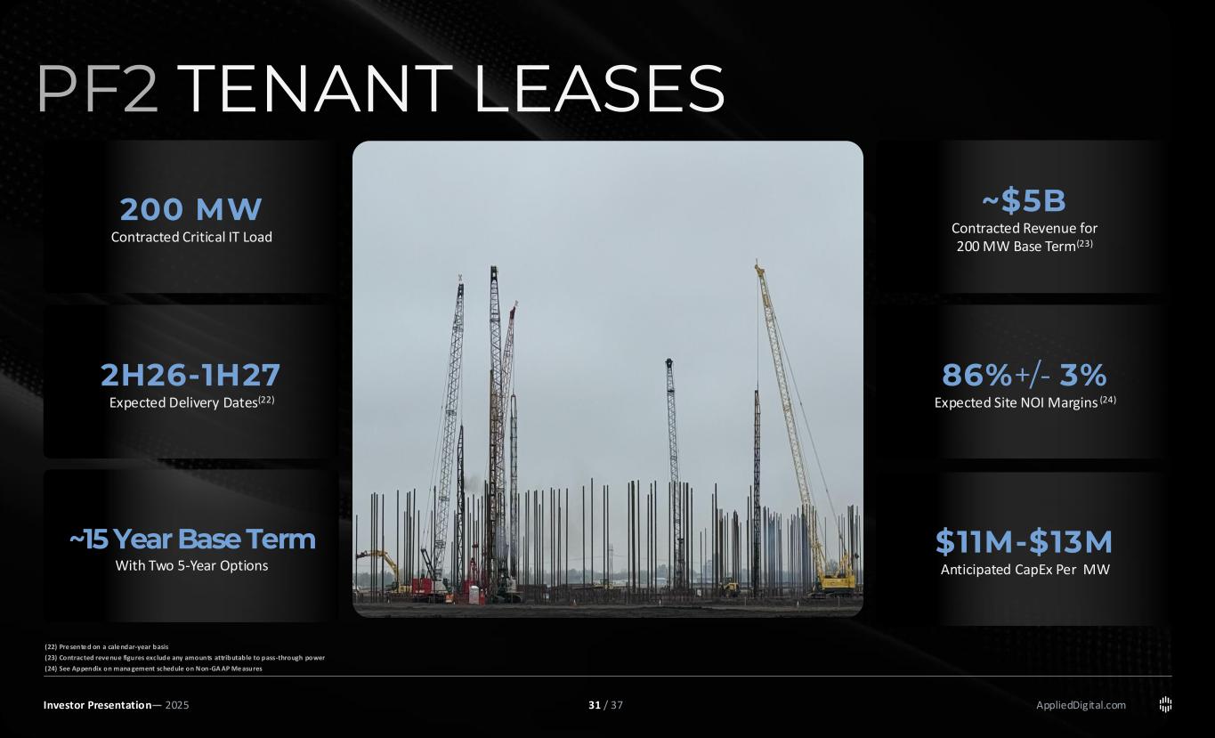 AppliedDigital.com PF2 TENANT LEASES (17) 200 MW Contracted Critical IT Load 2H26-1H27 Expected Delivery Dates(22) ~15 Year Base Term With Two 5-Year Options ~$5B Contracted Revenue for 200 MW Base Term(23) 86%+/- 3% Expected Site NOI Margins (24) (22) Pre sente d on a cale ndar-year basis (23) Contracted reve nue figures exclude any amounts attributable to pass-through power (24) See Appendix on mana gement schedule on Non-GA AP Me asures Investor Presentation— 2025 $11M-$13M Anticipated CapEx Per MW 31 / 37