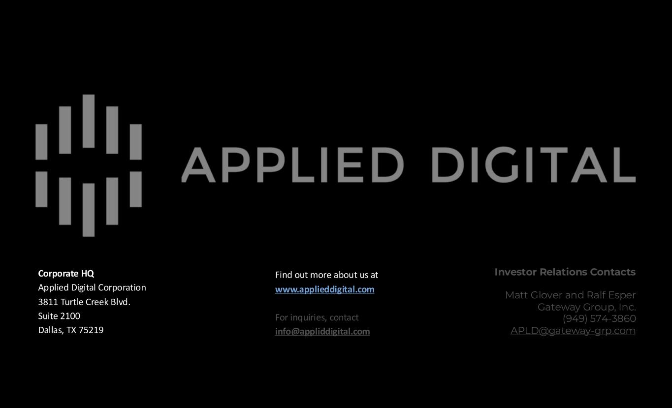 Find out more about us at www.applieddigital.com For inquiries, contact info@appliddigital.com Corporate HQ Applied Digital Corporation 3811 Turtle Creek Blvd. Suite 2100 Dallas, TX 75219 Investor Relations Contacts Matt Glover and Ralf Esper Gateway Group, Inc. (949) 574-3860 APLD@gateway-grp.com