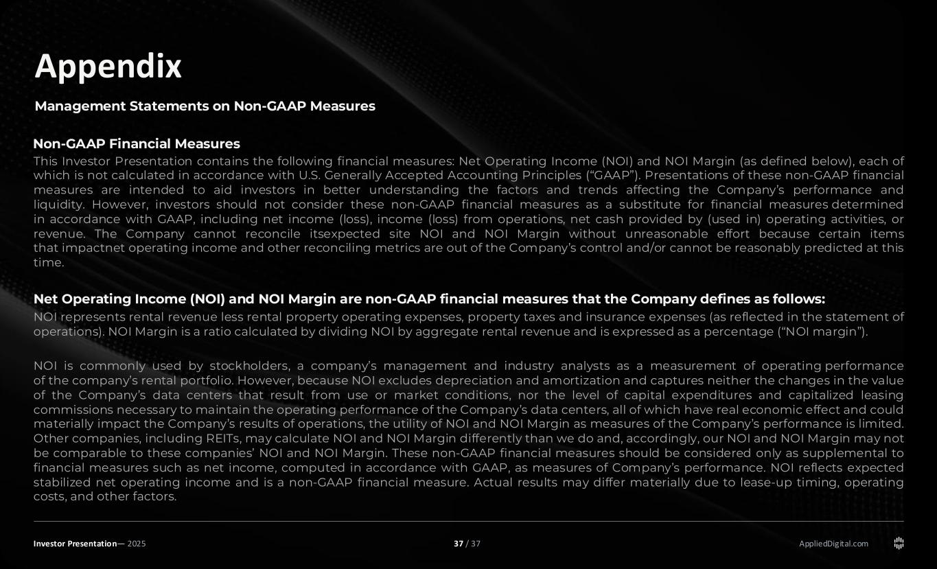 37 / 37 AppliedDigital.com Non-GAAP Financial Measures This Investor Presentation contains the following financial measures: Net Operating Income (NOI) and NOI Margin (as defined below), each of which is not calculated in accordance with U.S. Generally Accepted Accounting Principles (“GAAP”). Presentations of these non-GAAP financial measures are intended to aid investors in better understanding the factors and trends affecting the Company’s performance and liquidity. However, investors should not consider these non-GAAP financial measures as a substitute for financial measures determined in accordance with GAAP, including net income (loss), income (loss) from operations, net cash provided by (used in) operating activities, or revenue. The Company cannot reconcile itsexpected site NOI and NOI Margin without unreasonable effort because certain items that impactnet operating income and other reconciling metrics are out of the Company’s control and/or cannot be reasonably predicted at this time. Net Operating Income (NOI) and NOI Margin are non-GAAP financial measures that the Company defines as follows: NOI represents rental revenue less rental property operating expenses, property taxes and insurance expenses (as reflected in the statement of operations). NOI Margin is a ratio calculated by dividing NOI by aggregate rental revenue and is expressed as a percentage (“NOI margin”). NOI is commonly used by stockholders, a company’s management and industry analysts as a measurement of operating performance of the company’s rental portfolio. However, because NOI excludes depreciation and amortization and captures neither the changes in the value of the Company’s data centers that result from use or market conditions, nor the level of capital expenditures and capitalized leasing commissions necessary to maintain the operating performance of the Company’s data centers, all of which have real economic effect and could materially impact the Company’s results of operations, the utility of NOI and NOI Margin as measures of the Company’s performance is limited. Other companies, including REITs, may calculate NOI and NOI Margin differently than we do and, accordingly, our NOI and NOI Margin may not be comparable to these companies’ NOI and NOI Margin. These non-GAAP financial measures should be considered only as supplemental to financial measures such as net income, computed in accordance with GAAP, as measures of Company’s performance. NOI reflects expected stabilized net operating income and is a non-GAAP financial measure. Actual results may differ materially due to lease-up timing, operating costs, and other factors. Appendix Management Statements on Non-GAAP Measures Investor Presentation— 2025
