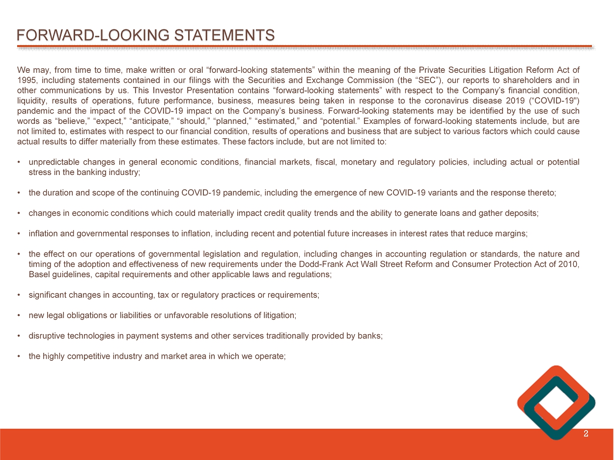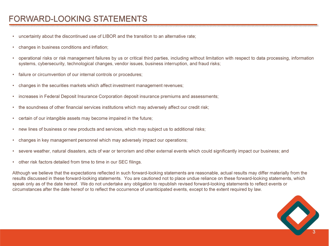 FORWARD - LOOKING STATEMENTS 2 We may, from time to time, make written or oral “forward - looking statements” within the meaning of the Private Securities Litigation Reform Act of 1995 , including statements contained in our filings with the Securities and Exchange Commission (the “SEC”), our reports to shareholders and in other communications by us . This Investor Presentation contains “forward - looking statements” with respect to the Company’s financial condition, liquidity , results of operations, future performance, business, measures being taken in response to the coronavirus disease 2019 (“COVID - 19 ") pandemic and the impact of the COVID - 19 impact on the Company’s business . Forward - looking statements may be identified by the use of such words as “believe,” “expect,” “anticipate ,” “ should,” “planned,” “estimated,” and “potential . ” Examples of forward - looking statements include, but are not limited to, estimates with respect to our financial condition, results of operations and business that are subject to various factors which could cause actual results to differ materially from these estimates . These factors include, but are not limited to : • unpredictable changes in general economic conditions, financial markets, fiscal, monetary and regulatory policies, including actual or potential stress in the banking industry ; • the duration and scope of the continuing COVID - 19 pandemic, including the emergence of new COVID - 19 variants and the response thereto ; • changes in economic conditions which could materially impact credit quality trends and the ability to generate loans and gather deposits ; • inflation and governmental responses to inflation, including recent and potential future increases in interest rates that reduce margins ; • the effect on our operations of governmental legislation and regulation, including changes in accounting regulation or standards, the nature and timing of the adoption and effectiveness of new requirements under the Dodd - Frank Act Wall Street Reform and Consumer Protection Act of 2010 , Basel guidelines, capital requirements and other applicable laws and regulations ; • significant changes in accounting, tax or regulatory practices or requirements ; • new legal obligations or liabilities or unfavorable resolutions of litigation ; • disruptive technologies in payment systems and other services traditionally provided by banks ; • the highly competitive industry and market area in which we operate ;