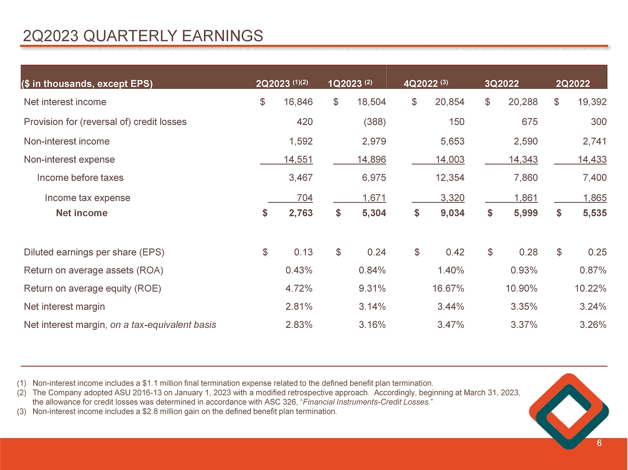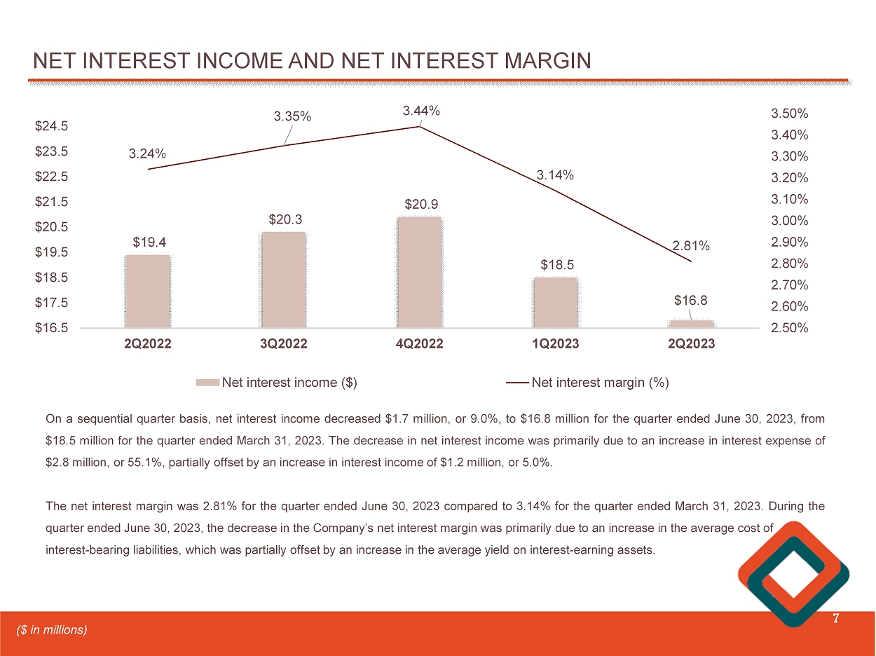 2 Q2023 QUARTERLY EARNINGS 6 2Q2022 3Q2022 4Q2022 (3) 1Q2023 (2) 2Q2023 (1)(2) ($ in thousands , except EPS) $ 19,392 $ 20,288 $ 20,854 $ 18,504 $ 16,846 Net interest income 300 675 150 (388) 420 Provision for (reversal of) credit losses 2,741 2,590 5,653 2,979 1,592 Non - interest income 14,433 14,343 14,003 14,896 14,551 Non - interest expense 7,400 7,860 12,354 6,975 3,467 Income before taxes 1,865 1,861 3,320 1,671 704 Income tax expense $ 5,535 $ 5,999 $ 9,034 $ 5,304 $ 2,763 Net income $ 0.25 $ 0.28 $ 0.42 $ 0.24 $ 0.13 Diluted earnings per share (EPS) 0.87% 0.93% 1.40% 0.84% 0.43% Return on average assets (ROA) 10.22% 10.90% 16.67% 9.31% 4.72% Return on average equity (ROE) 3.24% 3.35% 3.44% 3.14% 2.81% Net interest margin 3.26% 3.37% 3.47% 3.16% 2.83% Net interest margin, on a tax - equivalent basis (1) Non - interest income includes a $1.1 million final termination expense related to the defined benefit plan termination. (2) The Company adopted ASU 2016 - 13 on January 1, 2023 with a modified retrospective approach. Accordingly, beginning at March 31, 2023, the allowance for credit losses was determined in accordance with ASC 326, “ Financial Instruments - Credit Losses .” (3) Non - interest income includes a $2.8 million gain on the defined benefit plan termination.