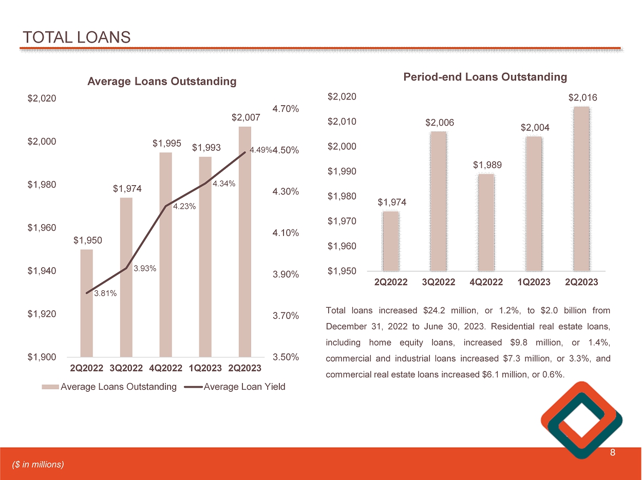 NET INTEREST INCOME AND NET INTEREST MARGIN 7 $19.4 $20.3 $20.9 $18.5 $16.8 3.24% 3.35% 3.44% 3.14% 2.81% 2.50% 2.60% 2.70% 2.80% 2.90% 3.00% 3.10% 3.20% 3.30% 3.40% 3.50% 2Q2022 3Q2022 4Q2022 1Q2023 2Q2023 $16.5 $17.5 $18.5 $19.5 $20.5 $21.5 $22.5 $23.5 $24.5 Net interest income ($) Net interest margin (%) On a sequential quarter basis, net interest income decreased $ 1 . 7 million, or 9 . 0 % , to $ 16 . 8 million for the quarter ended June 30 , 2023 , from $ 18 . 5 million for the quarter ended March 31 , 2023 . The decrease in net interest income was primarily due to an increase in interest expense of $ 2 . 8 million, or 55 . 1 % , partially offset by an increase in interest income of $ 1 . 2 million, or 5 . 0 % . The net interest margin was 2 . 81 % for the quarter ended June 30 , 2023 compared to 3 . 14 % for the quarter ended March 31 , 2023 . During the quarter ended June 30 , 2023 , the decrease in the Company’s net interest margin was primarily due to an increase in the average cost of i nterest - bearing liabilities, which was partially offset by an increase in the average yield on interest - earning assets . ($ in millions)