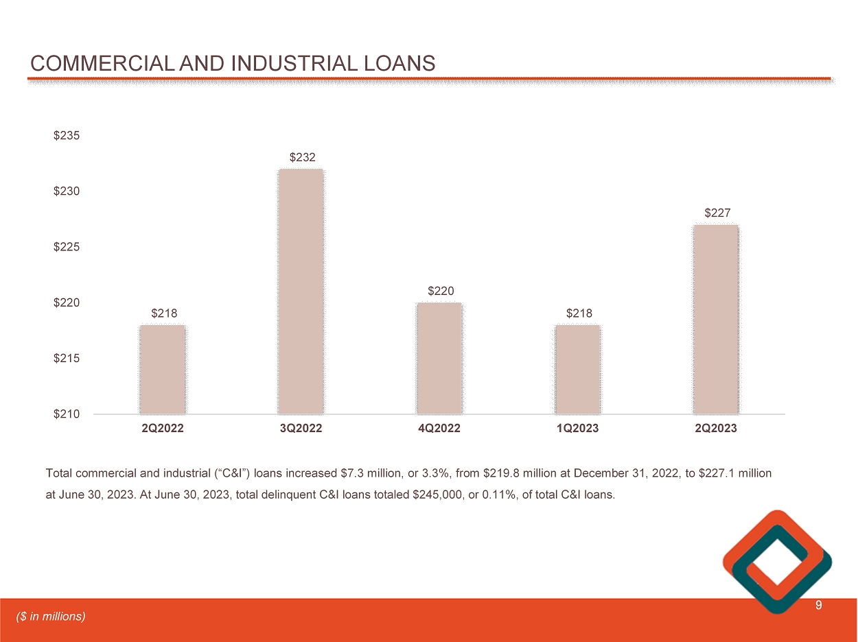TOTAL LOANS 8 $1,950 $1,974 $1,995 $1,993 $2,007 3.81% 3.93% 4.23% 4.34% 4.49% 3.50% 3.70% 3.90% 4.10% 4.30% 4.50% 4.70% 2Q2022 3Q2022 4Q2022 1Q2023 2Q2023 $1,900 $1,920 $1,940 $1,960 $1,980 $2,000 $2,020 Average Loans Outstanding Average Loans Outstanding Average Loan Yield $1,974 $2,006 $1,989 $2,004 $2,016 2Q2022 3Q2022 4Q2022 1Q2023 2Q2023 $1,950 $1,960 $1,970 $1,980 $1,990 $2,000 $2,010 $2,020 Period - end Loans Outstanding Total loans increased $ 24 . 2 million , or 1 . 2 % , to $ 2 . 0 billion from December 31 , 2022 to June 30 , 2023 . R esidential real estate loans, including home equity loans, increased $ 9 . 8 million, or 1 . 4 % , commercial and industrial loans increased $ 7 . 3 million, or 3 . 3 % , and commercial real estate loans increased $ 6 . 1 million, or 0 . 6 % . ($ in millions)