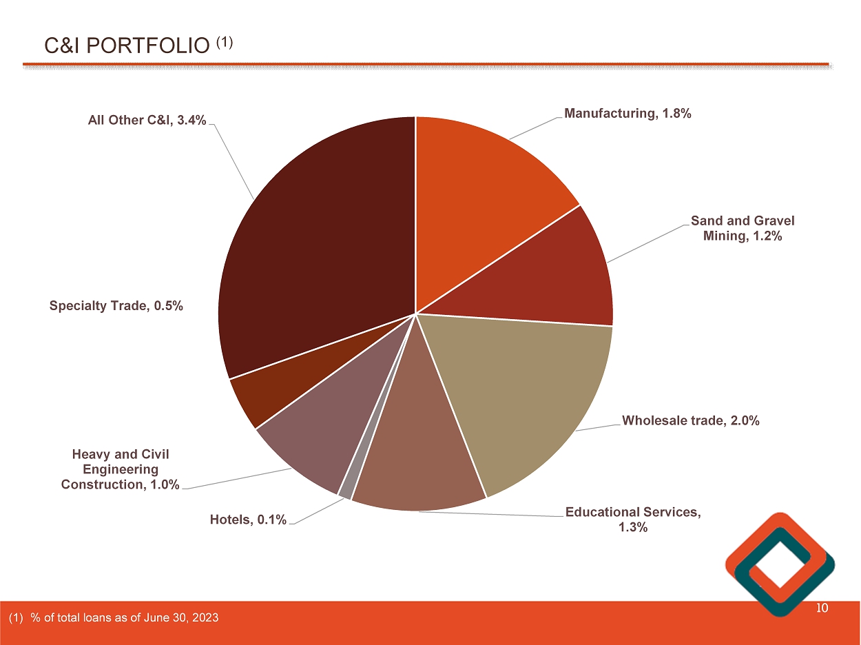 COMMERCIAL AND INDUSTRIAL LOANS 9 $218 $232 $220 $218 $227 2Q2022 3Q2022 4Q2022 1Q2023 2Q2023 $210 $215 $220 $225 $230 $235 Total commercial and industrial (“C&I”) loans increased $ 7 . 3 million, or 3 . 3 % , from $ 219 . 8 million at December 31 , 2022 , to $ 227 . 1 million at June 30 , 2023 . At June 30 , 2023 , total delinquent C&I loans totaled $ 245 , 000 , or 0 . 11 % , of total C&I loans . ($ in millions)