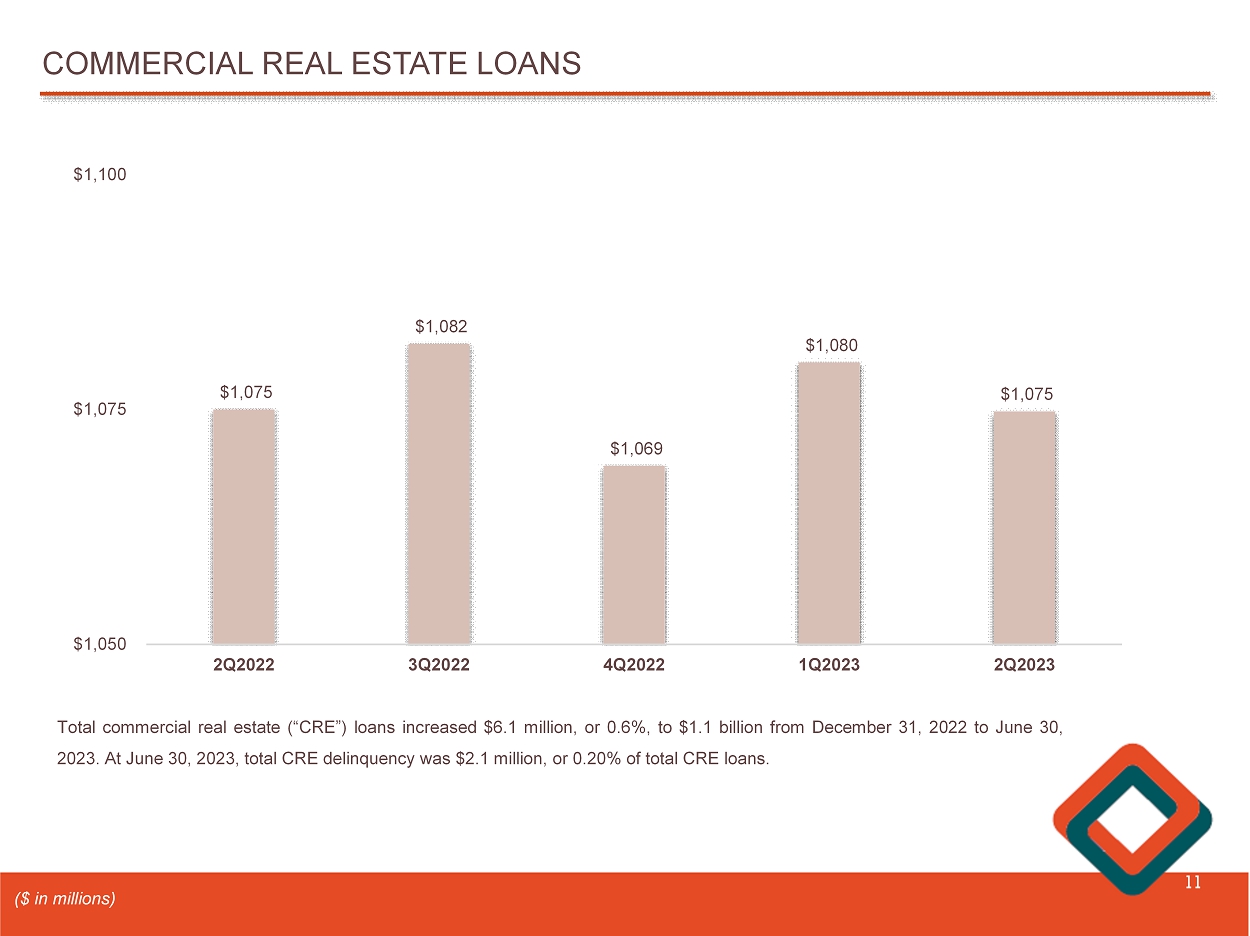 C&I PORTFOLIO (1) 10 (1) % of total loans as of June 30, 2023 Manufacturing , 1.8% Sand and Gravel Mining , 1.2% Wholesale trade , 2.0% Educational Services, 1.3% Hotels , 0.1% Heavy and Civil Engineering Construction, 1.0% Specialty Trade, 0.5% All Other C&I, 3.4%