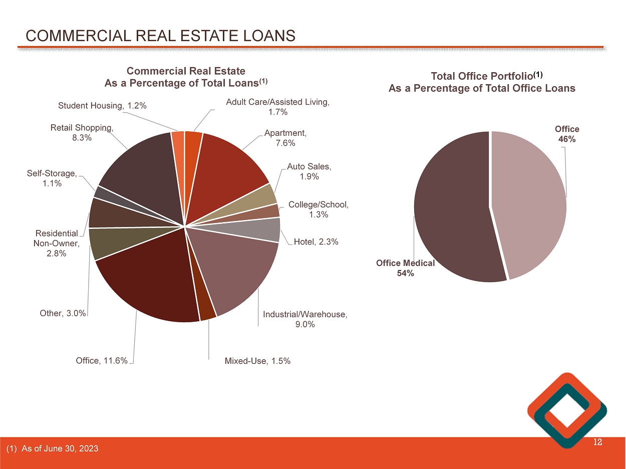 COMMERCIAL REAL ESTATE LOANS 11 $1,075 $1,082 $1,069 $1,080 $1,075 2Q2022 3Q2022 4Q2022 1Q2023 2Q2023 $1,050 $1,075 $1,100 Total commercial real estate (“CRE”) loans increased $ 6 . 1 million, or 0 . 6 % , to $ 1 . 1 billion from December 31 , 2022 to June 30 , 2023 . At June 30 , 2023 , total CRE delinquency was $ 2 . 1 million, or 0 . 20 % of total CRE loans . ($ in millions)