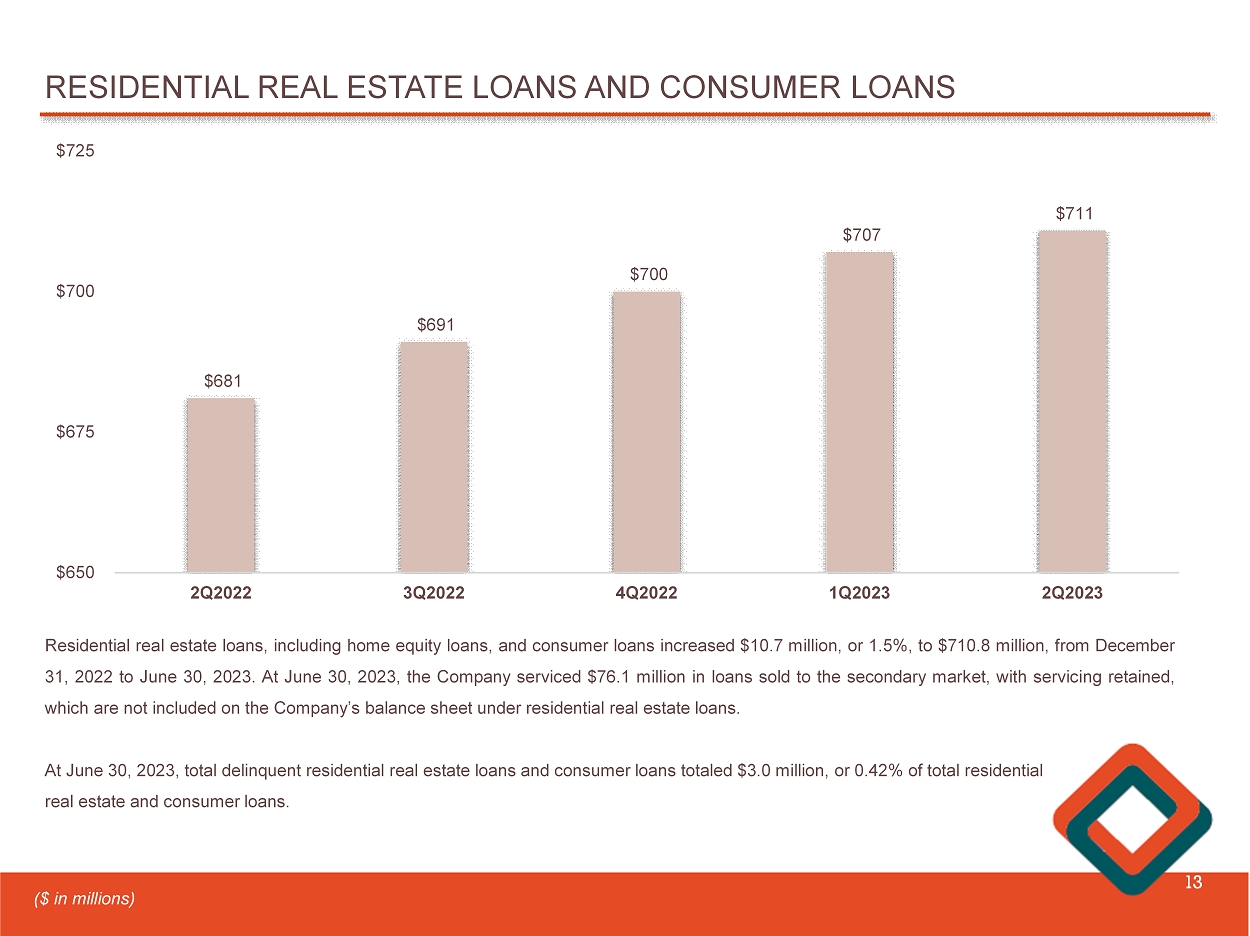 COMMERCIAL REAL ESTATE LOANS 12 (1) As of June 30, 2023 Adult Care/Assisted Living, 1.7% Apartment, 7.6% Auto Sales, 1.9% College/School , 1.3% Hotel, 2.3% Industrial/Warehouse , 9.0% Mixed - Use, 1.5% Office, 11.6% Other , 3.0% Residential Non - Owner , 2.8% Self - Storage , 1.1% Retail Shopping, 8.3% Student Housing , 1.2% Commercial Real Estate As a Percentage of Total Loans (1 ) Office 46% Office Medical 54% Total Office Portfolio As a Percentage of Total Office Loans (1)