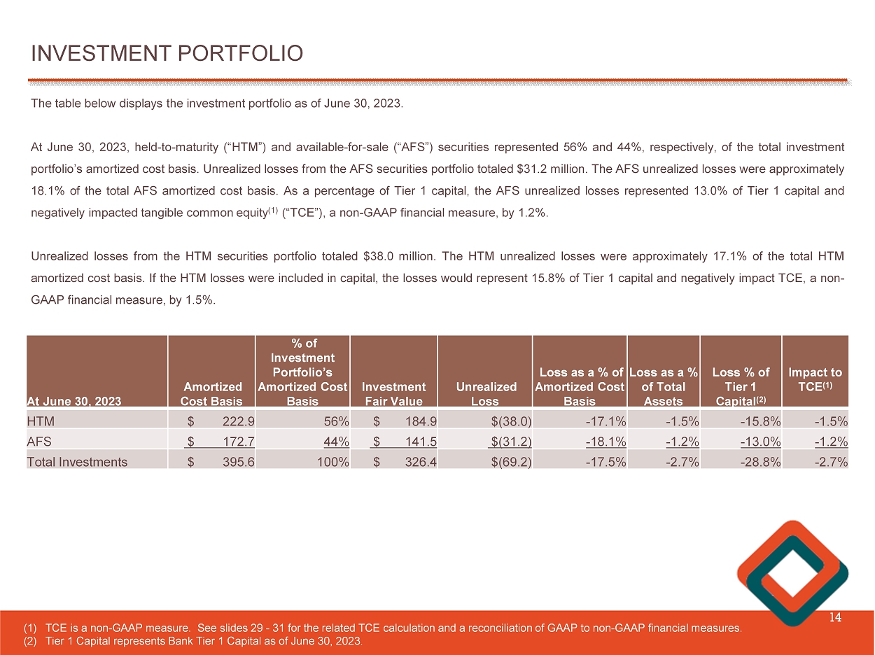 INVESTMENT PORTFOLIO 14 The table below displays the investment portfolio as of June 30 , 2023 . At June 30 , 2023 , held - to - maturity (“HTM”) and available - for - sale (“AFS”) securities represented 56 % and 44 % , respectively, of the total investment portfolio’s amortized cost basis . Unrealized losses from the AFS securities portfolio totaled $ 31 . 2 million . The AFS unrealized losses were approximately 18 . 1 % of the total AFS amortized cost basis . As a percentage of Tier 1 capital, the AFS unrealized losses represented 13 . 0 % of Tier 1 capital and negatively impacted tangible common equity ( 1 ) (“TCE”), a non - GAAP financial measure, by 1 . 2 % . Unrealized losses from the HTM securities portfolio totaled $ 38 . 0 million . The HTM unrealized losses were approximately 17 . 1 % of the total HTM amortized cost basis . If the HTM losses were included in capital, the losses would represent 15 . 8 % of Tier 1 capital and negatively impact TCE, a non - GAAP financial measure, by 1 . 5 % . Impact to TCE (1) Loss % of Tier 1 Capital (2) Loss as a % of Total Assets Loss as a % of Amortized Cost Basis Unrealized Loss Investment Fair Value % of Investment Portfolio’s Amortized Cost Basis Amortized Cost Basis At June 30, 2023 - 1.5% - 15.8% - 1.5% - 17.1% $(38.0) $ 184.9 56% $ 222.9 HTM - 1.2% - 13.0% - 1.2% - 18.1% $(31.2) $ 141.5 44% $ 172.7 AFS - 2.7% - 28.8% - 2.7% - 17.5% $(69.2) $ 326.4 100% $ 395.6 Total Investments (1) TCE is a non - GAAP measure. See slides 29 - 31 for the related TCE calculation and a reconciliation of GAAP to non - GAAP financial measures . (2) Tier 1 Capital represents Bank Tier 1 Capital as of June 30, 2023.