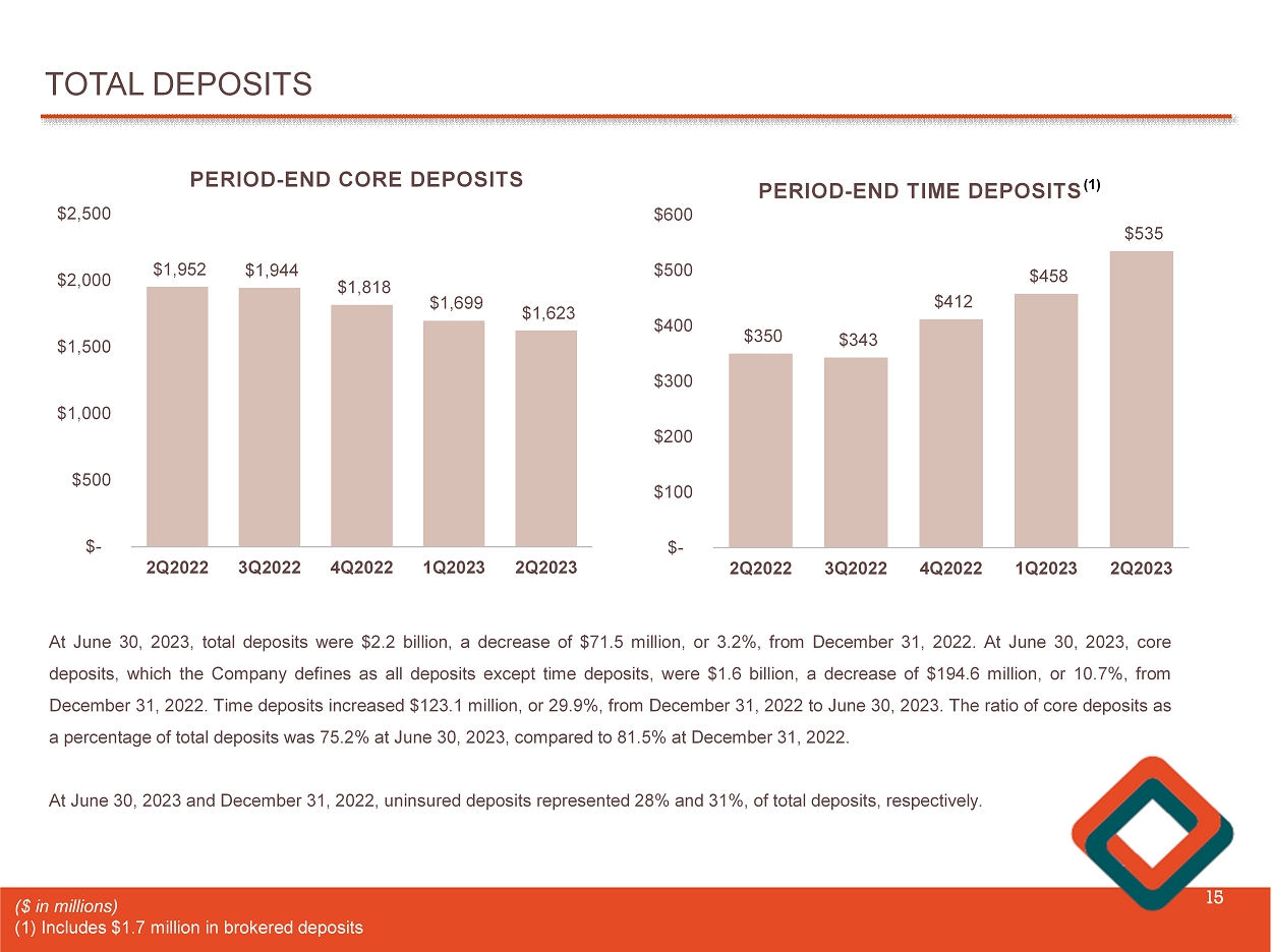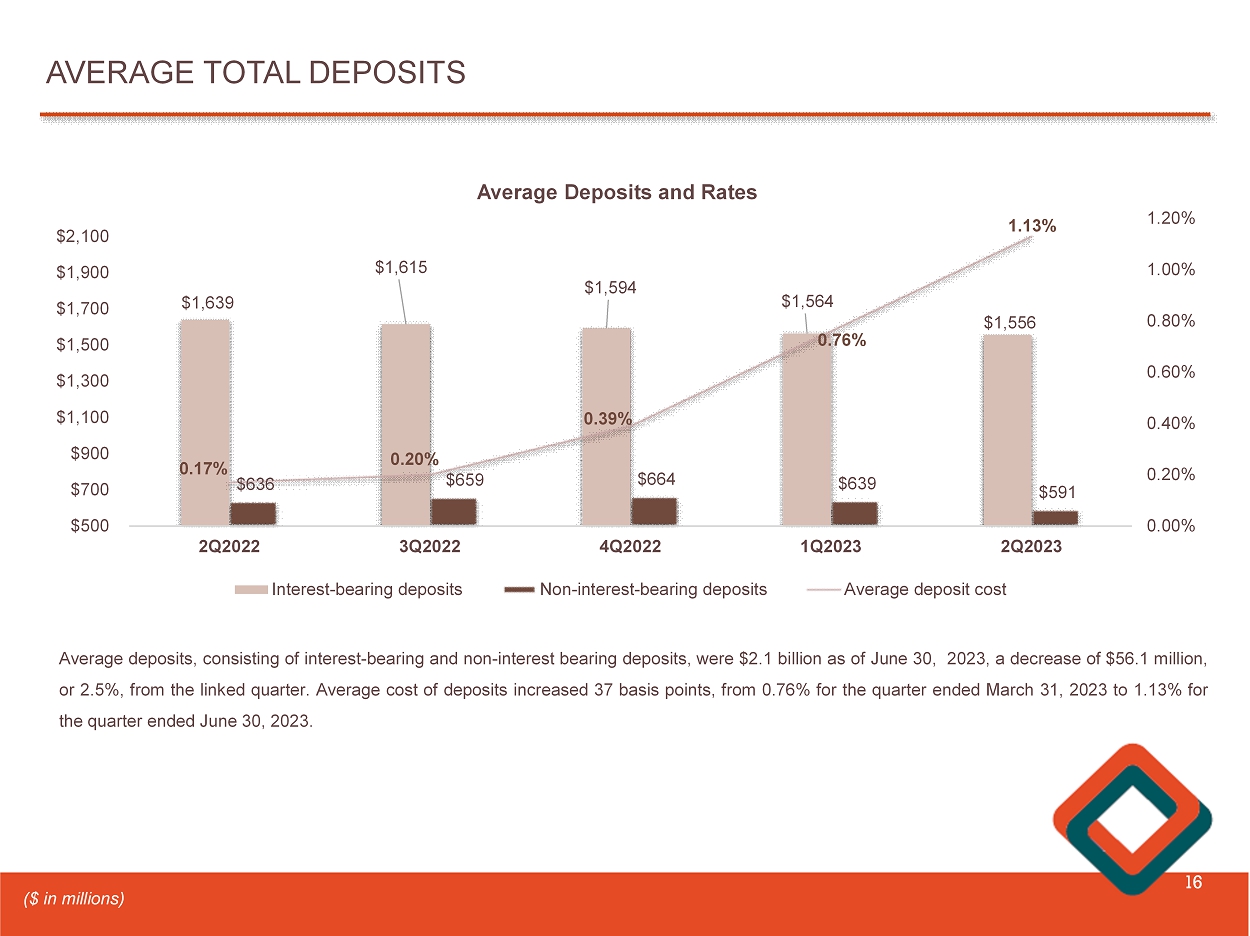 TOTAL DEPOSITS 15 $1,952 $1,944 $1,818 $1,699 $1,623 2Q2022 3Q2022 4Q2022 1Q2023 2Q2023 $- $500 $1,000 $1,500 $2,000 $2,500 PERIOD - END CORE DEPOSITS At June 30 , 2023 , total deposits were $ 2 . 2 billion, a decrease of $ 71 . 5 million, or 3 . 2 % , from December 31 , 2022 . At June 30 , 2023 , core deposits, which the Company defines as all deposits except time deposits, were $ 1 . 6 billion, a decrease of $ 194 . 6 million, or 10 . 7 % , from December 31 , 2022 . Time deposits increased $ 123 . 1 million, or 29 . 9 % , from December 31 , 2022 to June 30 , 2023 . The ratio of core deposits as a percentage of total deposits was 75 . 2 % at June 30 , 2023 , compared to 81 . 5 % at December 31 , 2022 . At June 30 , 2023 and December 31 , 2022 , uninsured deposits represented 28 % and 31 % , of total deposits, respectively . $350 $343 $412 $458 $535 2Q2022 3Q2022 4Q2022 1Q2023 2Q2023 $- $100 $200 $300 $400 $500 $600 PERIOD - END TIME DEPOSITS ($ in millions) (1) Includes $1.7 million in brokered deposits (1)