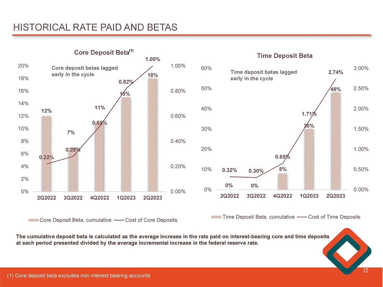 AVERAGE TOTAL DEPOSITS 16 $1,639 $1,615 $1,594 $1,564 $1,556 $636 $659 $664 $639 $591 0.17% 0.20% 0.39% 0.76% 1.13% 0.00% 0.20% 0.40% 0.60% 0.80% 1.00% 1.20% 2Q2022 3Q2022 4Q2022 1Q2023 2Q2023 $500 $700 $900 $1,100 $1,300 $1,500 $1,700 $1,900 $2,100 Average Deposits and Rates Interest-bearing deposits Non-interest-bearing deposits Average deposit cost Average deposits, consisting of interest - bearing and non - interest bearing deposits, were $ 2 . 1 billion as of June 30 , 2023 , a decrease of $ 56 . 1 million, or 2 . 5 % , from the linked quarter . Average cost of deposits increased 37 basis points, from 0 . 76 % for the quarter ended March 31 , 2023 to 1 . 13 % for the quarter ended June 30 , 2023 . ($ in millions)