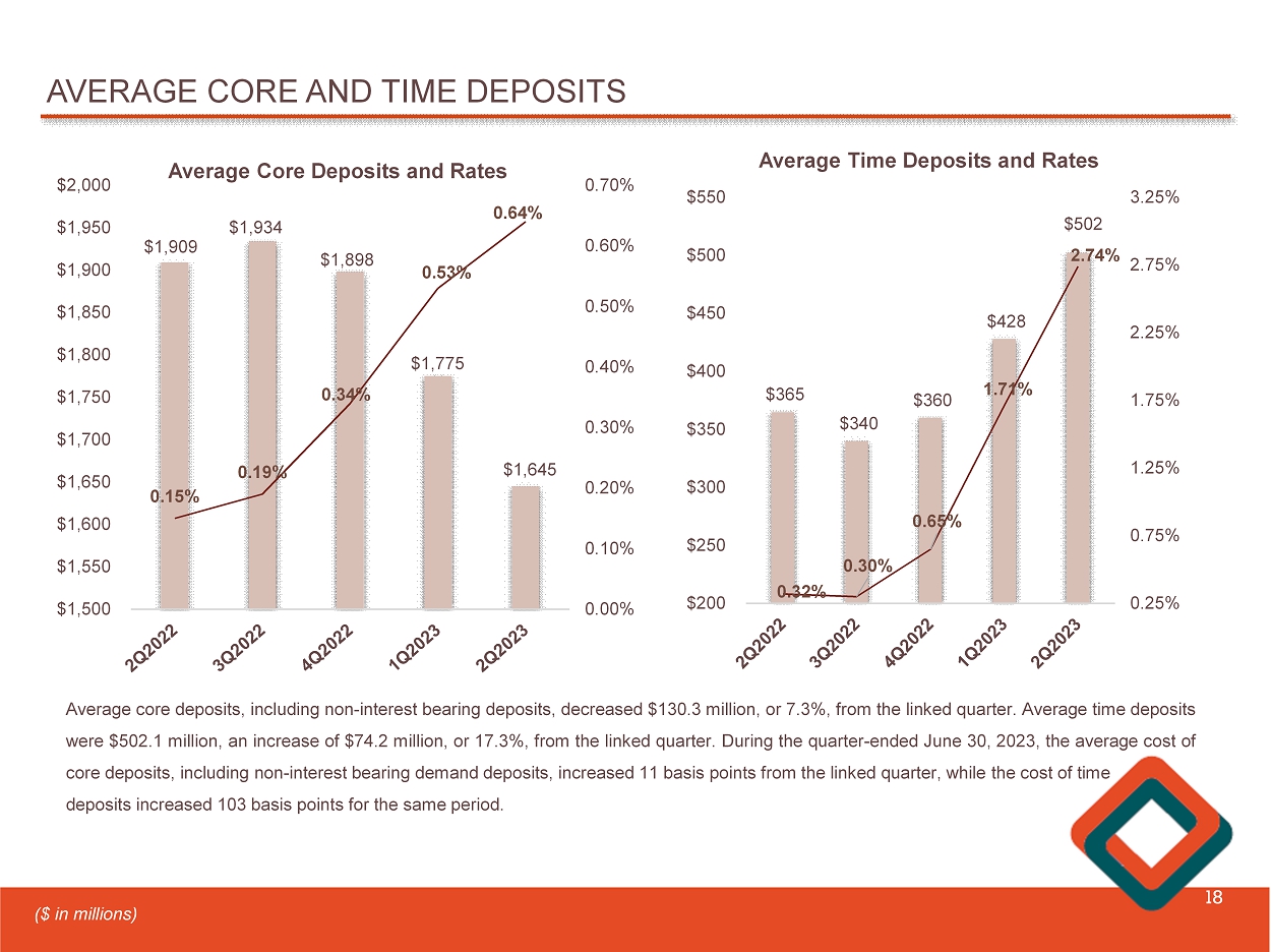 HISTORICAL RATE PAID AND BETAS 17 (1) Core deposit beta excludes non - interest bearing accounts 12% 7% 11% 15% 18% 0.22% 0.28% 0.52% 0.82% 1.00% 0.00% 0.20% 0.40% 0.60% 0.80% 1.00% 2Q2022 3Q2022 4Q2022 1Q2023 2Q2023 0% 2% 4% 6% 8% 10% 12% 14% 16% 18% 20% Core Deposit Beta Core Deposit Beta, cumulative Cost of Core Deposits (1) 0% 0% 8% 30% 48% 0.32% 0.30% 0.65% 1.71% 2.74% 0.00% 0.50% 1.00% 1.50% 2.00% 2.50% 3.00% 2Q2022 3Q2022 4Q2022 1Q2023 2Q2023 0% 10% 20% 30% 40% 50% 60% Time Deposit Beta Time Deposit Beta, cumulative Cost of Time Deposits Time deposit betas lagged early in the cycle The cumulative deposit beta is calculated as the average increase in the rate paid on interest - bearing core and time deposits at each period presented divided by the average incremental increase in the federal reserve rate. Core deposit betas lagged early in the cycle