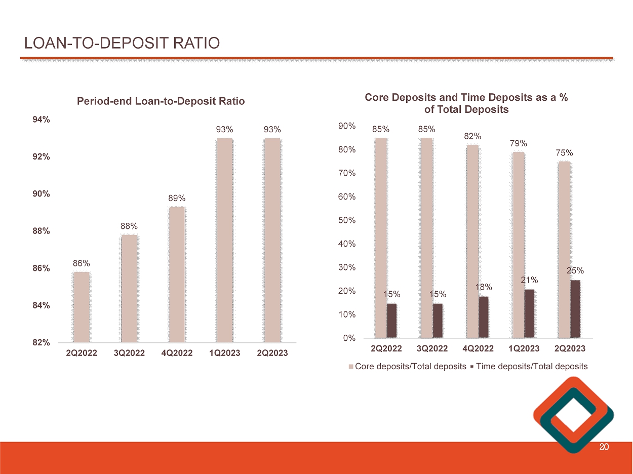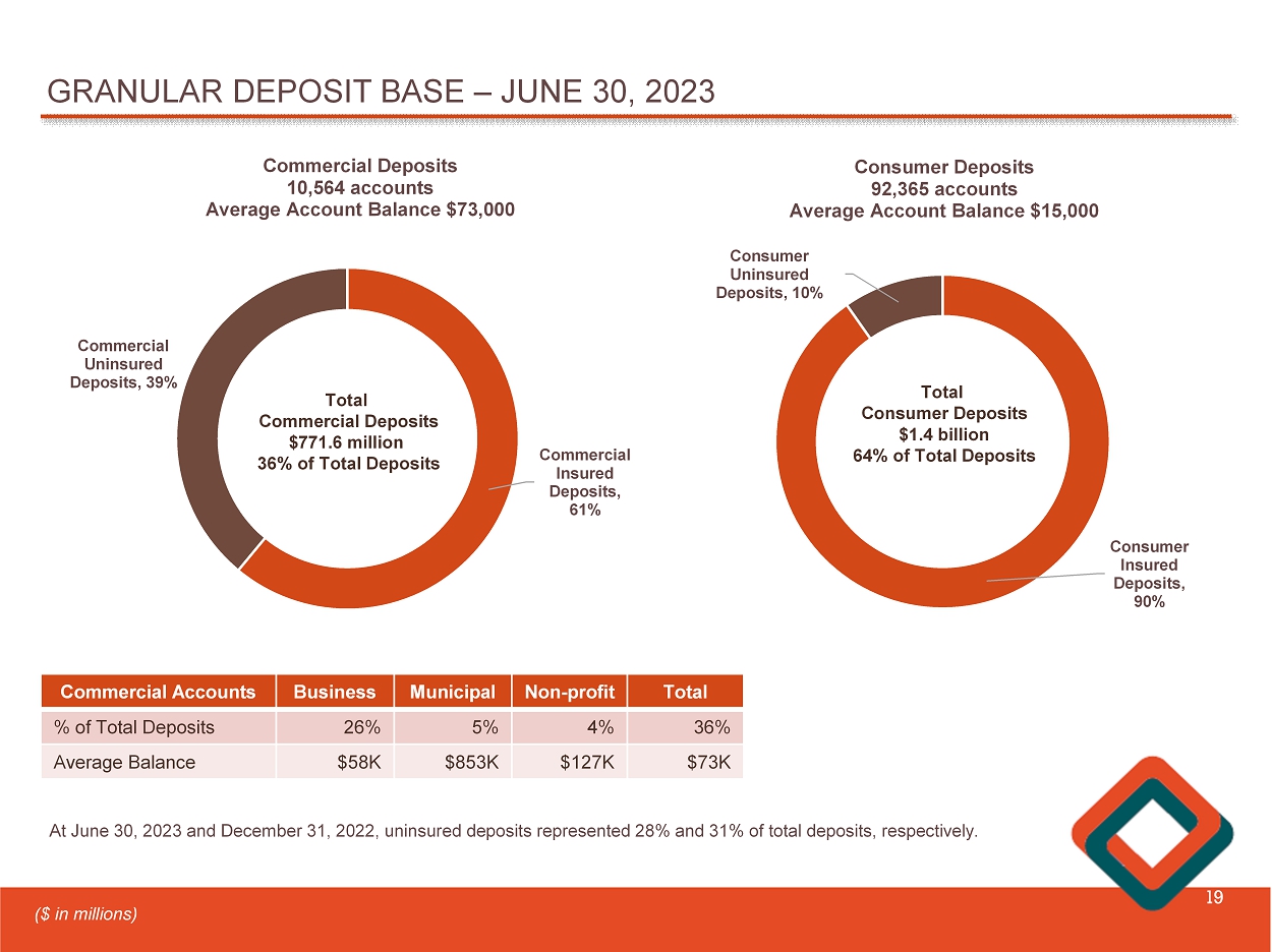 AVERAGE CORE AND TIME DEPOSITS 18 $1,909 $1,934 $1,898 $1,775 $1,645 0.15% 0.19% 0.34% 0.53% 0.64% 0.00% 0.10% 0.20% 0.30% 0.40% 0.50% 0.60% 0.70% $1,500 $1,550 $1,600 $1,650 $1,700 $1,750 $1,800 $1,850 $1,900 $1,950 $2,000 Average Core Deposits and Rates Average core deposits, including non - interest bearing deposits, decreased $ 130 . 3 million, or 7 . 3 % , from the linked quarter . Average time deposits were $ 502 . 1 million, an increase of $ 74 . 2 million, or 17 . 3 % , from the linked quarter . During the quarter - ended June 30 , 2023 , the average cost of core deposits, including non - interest bearing demand deposits, increased 11 basis points from the linked quarter, while the cost of time deposits increased 103 basis points for the same period . ($ in millions) $365 $340 $360 $428 $502 0.32% 0.30% 0.65% 1.71% 2.74% 0.25% 0.75% 1.25% 1.75% 2.25% 2.75% 3.25% $200 $250 $300 $350 $400 $450 $500 $550 Average Time Deposits and Rates