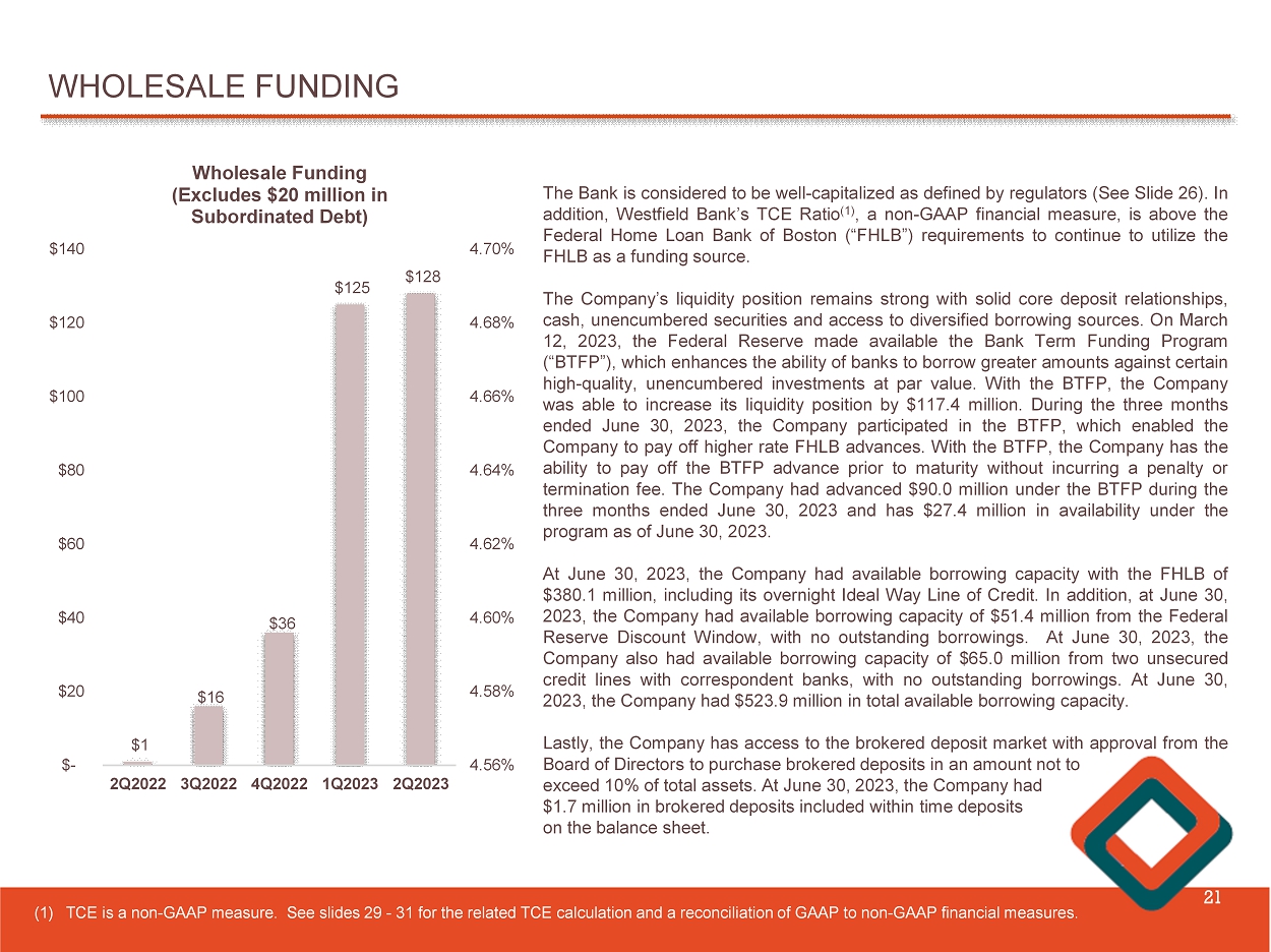 WHOLESALE FUNDING 21 $1 $16 $36 $125 $128 4.56% 4.58% 4.60% 4.62% 4.64% 4.66% 4.68% 4.70% 2Q2022 3Q2022 4Q2022 1Q2023 2Q2023 $- $20 $40 $60 $80 $100 $120 $140 Wholesale Funding (Excludes $20 million in Subordinated Debt) The Bank is considered to be well - capitalized as defined by regulators (See Slide 26 ) . In addition , Westfield Bank’s TCE Ratio ( 1 ) , a non - GAAP financial measure, is above the Federal Home Loan Bank of Boston (“FHLB”) requirements to continue to utilize the FHLB as a funding source . The Company’s liquidity position remains strong with solid core deposit relationships, cash, unencumbered securities and access to diversified borrowing sources . On March 12 , 2023 , the Federal Reserve made available the Bank Term Funding Program (“BTFP”), which enhances the ability of banks to borrow greater amounts against certain high - quality, unencumbered investments at par value . With the BTFP, the Company was able to increase its liquidity position by $ 117 . 4 million . During the three months ended June 30 , 2023 , the Company participated in the BTFP, which enabled the Company to pay off higher rate FHLB advances . With the BTFP, the Company has the ability to pay off the BTFP advance prior to maturity without incurring a penalty or termination fee . The Company had advanced $ 90 . 0 million under the BTFP during the three months ended June 30 , 2023 and has $ 27 . 4 million in availability under the program as of June 30 , 2023 . At June 30 , 2023 , the Company had available borrowing capacity with the FHLB of $ 380 . 1 million, including its overnight Ideal Way Line of Credit . In addition, at June 30 , 2023 , the Company had available borrowing capacity of $ 51 . 4 million from the Federal Reserve Discount Window, with no outstanding borrowings . At June 30 , 2023 , the Company also had available borrowing capacity of $ 65 . 0 million from two unsecured credit lines with correspondent banks, with no outstanding borrowings . At June 30 , 2023 , the Company had $ 523 . 9 million in total available borrowing capacity . Lastly, the Company has access to the brokered deposit market with approval from the Board of Directors to purchase brokered deposits in an amount not to e xceed 10 % of total assets . At June 30 , 2023 , the Company had $ 1 . 7 million in brokered deposits included within time deposits on the balance sheet . (1) TCE is a non - GAAP measure. See slides 29 - 31 for the related TCE calculation and a reconciliation of GAAP to non - GAAP financial measures .