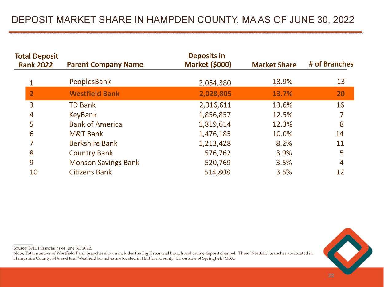 ________ Source: SNL Financial as of June 30, 2022. Note: Total number of Westfield Bank branches shown includes the Big E seasonal branch and online deposit channel. Three Wes tfi eld branches are located in Hampshire County, MA and four Westfield branches are located in Hartford County, CT outside of Springfield MSA. DEPOSIT MARKET SHARE IN HAMPDEN COUNTY, MA AS OF JUNE 30, 2022 22 Total Deposit Rank 2022 Parent Company Name Deposits in Market ($000) Market Share # of Branches 1 PeoplesBank 2,054,380 13.9% 13 1,762,519 13.1% 20 2 Westfield Bank 2,028,805 13.7% 20 3 TD Bank 2,016,611 13.6% 16 4 KeyBank 1,856,857 12.5% 7 5 Bank of America 1,819,614 12.3% 8 6 M&T Bank 1,476,185 10.0% 14 7 Berkshire Bank 1,213,428 8.2% 11 8 Country Bank 576,762 3.9% 5 9 Monson Savings Bank 520,769 3.5% 4 10 Citizens Bank 514,808 3.5% 12