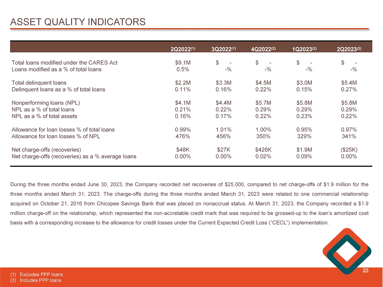 ASSET QUALITY INDICATORS 23 2Q2023 (2) 1Q2023 (2) 4Q2022 (2) 3Q2022 (1) 2Q2022 (1) $ - $ - $ - $ - $9.1M Total loans modified under the CARES Act - % - % - % - % 0.5% Loans modified as a % of total loans $5.4M $3.0M $4.5M $3.3M $2.2M Total delinquent loans 0.27% 0.15% 0.22% 0.16% 0.11% Delinquent loans as a % of total loans $5.8M $5.8M $5.7M $4.4M $4.1M Nonperforming loans (NPL) 0.29% 0.29% 0.29% 0.22% 0.21% NPL as a % of total loans 0.22% 0.23% 0.22% 0.17% 0.16% NPL as a % of total assets 0.97% 0.95% 1.00% 1.01% 0.99% Allowance for loan losses % of total loans 341% 329% 350% 456% 476% Allowance for loan losses % of NPL ($25K) $1.9M $426K $27K $48K Net charge - offs (recoveries) 0.00% 0.09% 0.02% 0.00% 0.00% Net charge - offs (recoveries) as a % average loans (1) Excludes PPP loans (2) Includes PPP loans During the three months ended June 30 , 2023 , the Company recorded net recoveries of $ 25 , 000 , compared to net charge - offs of $ 1 . 9 million for the three months ended March 31 , 2023 . The charge - offs during the three months ended March 31 , 2023 were related to one commercial relationship acquired on October 21 , 2016 from Chicopee Savings Bank that was placed on nonaccrual status . At March 31 , 2023 , the Company recorded a $ 1 . 9 million charge - off on the relationship, which represented the non - accretable credit mark that was required to be grossed - up to the loan’s amortized cost basis with a corresponding increase to the allowance for credit losses under the Current Expected Credit Loss (“CECL”) implementation .