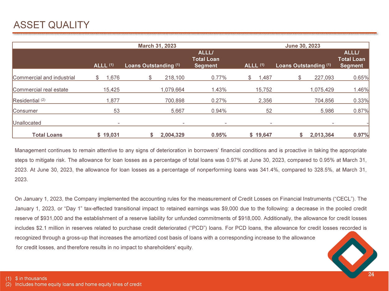 ASSET QUALITY 24 Management continues to remain attentive to any signs of deterioration in borrowers’ financial conditions and is proactive in taking the appropriate steps to mitigate risk . The allowance for loan losses as a percentage of total loans was 0 . 97 % at June 30 , 2023 , compared to 0 . 95 % at March 31 , 2023 . At June 30 , 2023 , the allowance for loan losses as a percentage of nonperforming loans was 341 . 4 % , compared to 328 . 5 % , at March 31 , 2023 . On January 1 , 2023 , the Company implemented the accounting rules for the measurement of Credit Losses on Financial Instruments (“CECL”) . The January 1 , 2023 , or “Day 1 ” tax - effected transitional impact to retained earnings was $ 9 , 000 due to the following : a decrease in the pooled credit reserve of $ 931 , 000 and the establishment of a reserve liability for unfunded commitments of $ 918 , 000 . Additionally, the allowance for credit losses includes $ 2 . 1 million in reserves related to purchase credit deteriorated (“PCD”) loans . For PCD loans, the allowance for credit losses recorded is recognized through a gross - up that increases the amortized cost basis of loans with a corresponding increase to the allowance for credit losses, and therefore results in no impact to shareholders' equity . June 30, 2023 March 31, 2023 ALLL/ Total Loan Segment Loans Outstanding (1) ALLL (1) ALLL/ Total Loan Segment Loans Outstanding (1) ALLL (1) 0.65% $ 227,093 $ 1,487 0.77% $ 218,100 $ 1,676 Commercial and industrial 1.46% 1,075,429 15,752 1.43% 1,079,664 15,425 Commercial real estate 0.33% 704,856 2,356 0.27% 700,898 1,877 Residential (2) 0.87% 5,986 52 0.94% 5,667 53 Consumer - - - - - - Unallocated 0.97% $ 2,013,364 $ 19,647 0.95% $ 2,004,329 $ 19,031 Total Loans (1) $ in thousands (2) Includes home equity loans and home equity lines of credit