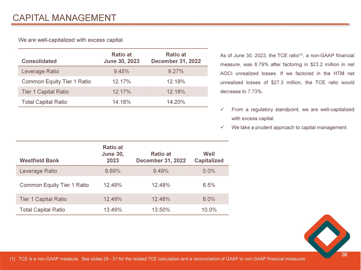 CAPITAL MANAGEMENT 26 We are well - capitalized with excess capital. Ratio at December 31, 2022 Ratio at June 30, 2023 Consolidated 9.27% 9.45% Leverage Ratio 12.18% 12.17% Common Equity Tier 1 Ratio 12.18% 12.17% Tier 1 Capital Ratio 14.20% 14.16% Total Capital Ratio As of June 30 , 2023 , the TCE ratio ( 1 ) , a non - GAAP financial measure, was 8 . 79 % after factoring in $ 23 . 2 million in net AOCI unrealized losses . If we factored in the HTM net unrealized losses of $ 27 . 3 million, the TCE ratio would decrease to 7 . 73 % . x From a regulatory standpoint, we are well - capitalized with excess capital . x We take a prudent approach to capital management . Well Capitalized Ratio at December 31, 2022 Ratio at June 30, 2023 Westfield Bank 5.0% 9.49% 9.69% Leverage Ratio 6.5% 12.48% 12.49% Common Equity Tier 1 Ratio 8.0% 12.48% 12.49% Tier 1 Capital Ratio 10.0% 13.50% 13.49% Total Capital Ratio (1) TCE is a non - GAAP measure. See slides 29 - 31 for the related TCE calculation and a reconciliation of GAAP to non - GAAP financial measures .