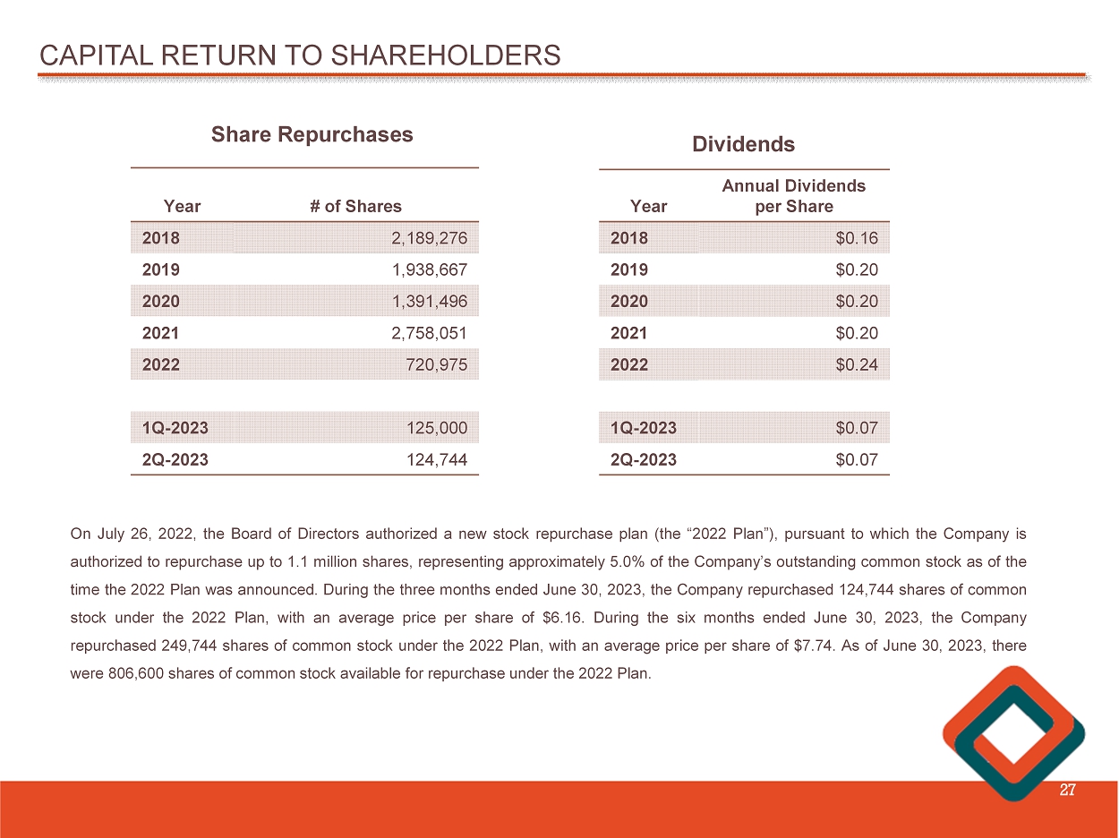 CAPITAL RETURN TO SHAREHOLDERS 27 # of Shares Year 2,189,276 2018 1,938,667 2019 1,391,496 2020 2,758,051 2021 720,975 2022 125,000 1Q - 2023 124,744 2Q - 2023 Annual Dividends per Share Year $0.16 2018 $0.20 2019 $0.20 2020 $0.20 2021 $0.24 2022 $0.07 1Q - 2023 $0.07 2Q - 2023 Share Repurchases Dividends On July 26 , 2022 , the Board of Directors authorized a new stock repurchase plan (the “ 2022 Plan”), pursuant to which the Company is authorized to repurchase up to 1 . 1 million shares, representing approximately 5 . 0 % of the Company’s outstanding common stock as of the time the 2022 Plan was announced . During the three months ended June 30 , 2023 , the Company repurchased 124 , 744 shares of common stock under the 2022 Plan, with an average price per share of $ 6 . 16 . During the six months ended June 30 , 2023 , the Company repurchased 249 , 744 shares of common stock under the 2022 Plan, with an average price per share of $ 7 . 74 . As of June 30 , 2023 , there were 806 , 600 shares of common stock available for repurchase under the 2022 Plan .