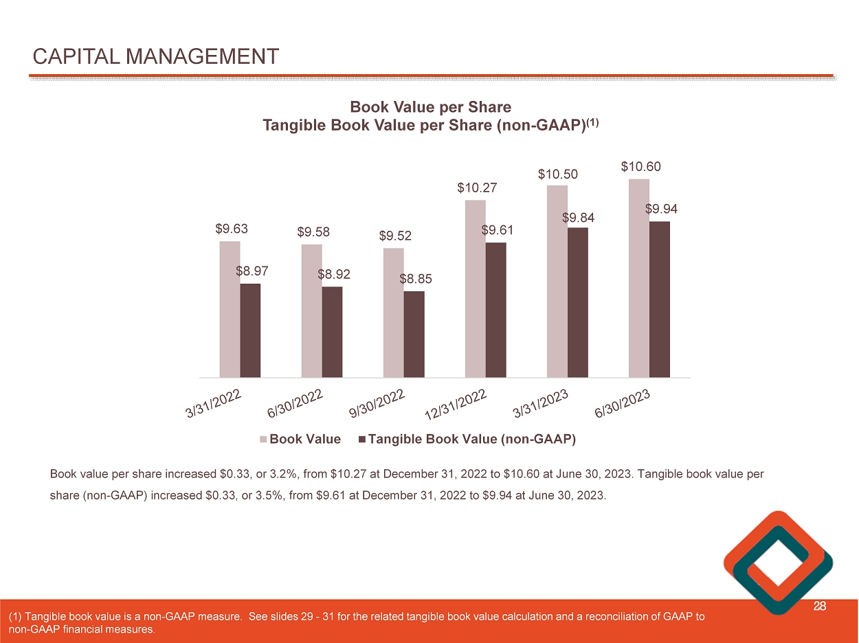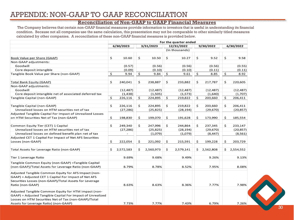 APPENDIX: NON - GAAP TO GAAP RECONCILIATION 30 Reconciliation of Non - GAAP to GAAP Financial Measures The Company believes that certain non - GAAP financial measures provide information to investors that is useful in understanding i ts financial condition. Because not all companies use the same calculation, this presentation may not be comparable to other similarly title d measures calculated by other companies. A reconciliation of these non - GAAP financial measures is provided below. 6/30/2023 3/31/2023 12/31/2022 9/30/2022 6/30/2022 Book Value per Share (GAAP) 10.60$ 10.50$ 10.27$ 9.52$ 9.58$ Non-GAAP adjustments: Goodwill (0.57) (0.56) (0.56) (0.56) (0.55) Core deposit intangible (0.09) (0.10) (0.10) (0.11) (0.11) Tangible Book Value per Share (non-GAAP) 9.94$ 9.84$ 9.61$ 8.85$ 8.92$ Total Bank Equity (GAAP) 240,041$ 238,887$ 233,882$ 217,787$ 220,605$ Non-GAAP adjustments: Goodwill (12,487) (12,487) (12,487) (12,487) (12,487) Core deposit intangible net of associated deferred tax (1,438) (1,505) (1,573) (1,640) (1,707) Tangible Capital (non-GAAP) 226,116$ 224,895$ 219,822$ 203,660$ 206,411$ Tangible Capital (non-GAAP) 226,116$ 224,895$ 219,822$ 203,660$ 206,411$ Unrealized losses on HTM securities net of tax (27,286) (25,825) (28,194) (29,670) (20,857) Adjusted Tangible Capital For Impact of Unrealized Losses on HTM Securities Net of Tax (non-GAAP) 198,830$ 199,070$ 191,628$ 173,990$ 185,554$ Common Equity Tier (CET) 1 Capital 249,340$ 247,996$ 244,864$ 237,345$ 233,147$ Unrealized losses on HTM securities net of tax (27,286) (25,825) (28,194) (29,670) (20,857) Unrealized losses on defined benefit plan net of tax - (1,079) (1,079) (8,447) (8,561) Adjusted CET 1 Capital For Impact of Net AFS Securities Losses (non-GAAP) 222,054$ 221,092$ 215,591$ 199,228$ 203,729$ Total Assets for Leverage Ratio (non-GAAP) 2,572,583$ 2,560,973$ 2,579,141$ 2,562,808$ 2,554,552$ Tier 1 Leverage Ratio 9.69% 9.68% 9.49% 9.26% 9.13% Tangible Common Equity (non-GAAP) =Tangible Capital (non-GAAP)/Total Assets for Leverage Ratio (non-GAAP) 8.79% 8.78% 8.52% 7.95% 8.08% Adjusted Tangible Common Equity for AFS Impact (non- GAAP) = Adjusted CET 1 Capital For Impact of Net AFS Securities Losses (non-GAAP)/Total Assets for Leverage Ratio (non-GAAP) 8.63% 8.63% 8.36% 7.77% 7.98% Adjusted Tangible Common Equity for HTM Impact (non- GAAP) = Adjusted Tangible Capital For Impact of Unrealized Losses on HTM Securities Net of Tax (non-GAAP)/Total Assets for Leverage Ratio) (non-GAAP) 7.73% 7.77% 7.43% 6.79% 7.26% For the quarter ended (In thousands)