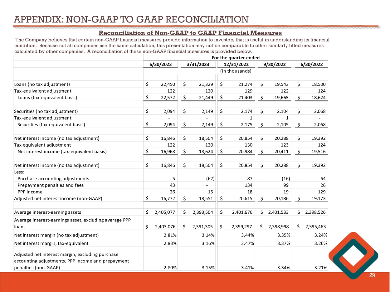 APPENDIX: NON - GAAP TO GAAP RECONCILIATION 29 Reconciliation of Non - GAAP to GAAP Financial Measures The Company believes that certain non - GAAP financial measures provide information to investors that is useful in understanding i ts financial condition. Because not all companies use the same calculation, this presentation may not be comparable to other similarly title d measures calculated by other companies. A reconciliation of these non - GAAP financial measures is provided below. 6/30/2023 3/31/2023 12/31/2022 9/30/2022 6/30/2022 Loans (no tax adjustment) 22,450$ 21,329$ 21,274$ 19,543$ 18,500$ Tax-equivalent adjustment 122 120 129 122 124 Loans (tax-equivalent basis) 22,572$ 21,449$ 21,403$ 19,665$ 18,624$ Securities (no tax adjustment) 2,094$ 2,149$ 2,174$ 2,104$ 2,068$ Tax-equivalent adjustment - - 1 1 - Securities (tax-equivalent basis) 2,094$ 2,149$ 2,175$ 2,105$ 2,068$ Net interest income (no tax adjustment) 16,846$ 18,504$ 20,854$ 20,288$ 19,392$ Tax equivalent adjustment 122 120 130 123 124 Net interest income (tax-equivalent basis) 16,968$ 18,624$ 20,984$ 20,411$ 19,516$ Net interest income (no tax adjustment) 16,846$ 18,504$ 20,854$ 20,288$ 19,392$ Less: Purchase accounting adjustments 5 (62) 87 (16) 64 Prepayment penalties and fees 43 - 134 99 26 PPP Income 26 15 18 19 129 Adjusted net interest income (non-GAAP) 16,772$ 18,551$ 20,615$ 20,186$ 19,173$ Average interest-earning assets 2,405,077$ 2,393,504$ 2,401,676$ 2,401,533$ 2,398,526$ Average interest-earnings asset, excluding average PPP loans $ 2,403,076 $ 2,391,305 $ 2,399,297 $ 2,398,998 $ 2,395,463 Net interest margin (no tax adjustment) 2.81% 3.14% 3.44% 3.35% 3.24% Net interest margin, tax-equivalent 2.83% 3.16% 3.47% 3.37% 3.26% Adjusted net interest margin, excluding purchase accounting adjustments, PPP Income and prepayment penalties (non-GAAP) 2.80% 3.15% 3.41% 3.34% 3.21% For the quarter ended (In thousands)