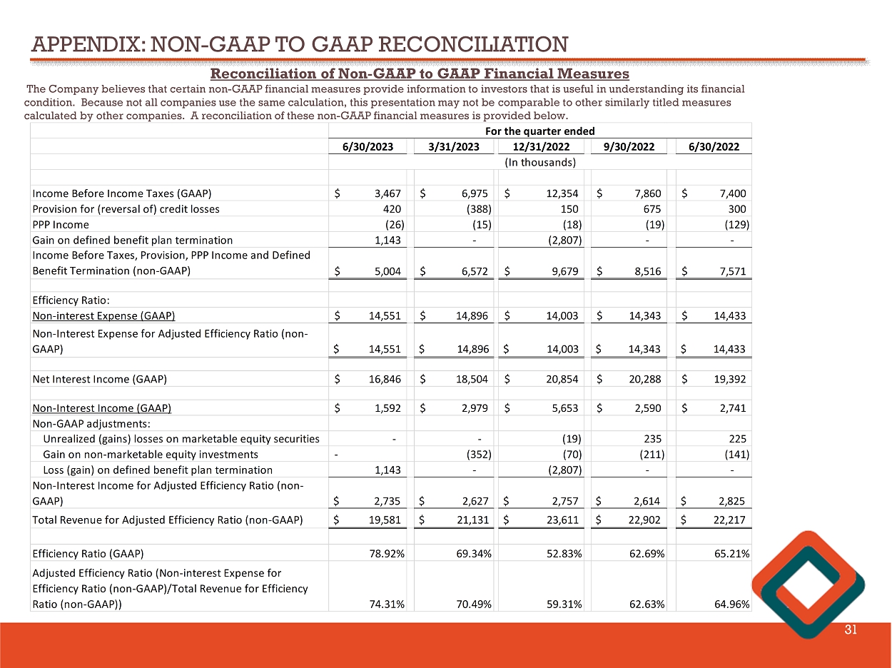 APPENDIX: NON - GAAP TO GAAP RECONCILIATION 31 Reconciliation of Non - GAAP to GAAP Financial Measures The Company believes that certain non - GAAP financial measures provide information to investors that is useful in understanding i ts financial condition. Because not all companies use the same calculation, this presentation may not be comparable to other similarly title d measures calculated by other companies. A reconciliation of these non - GAAP financial measures is provided below. 6/30/2023 3/31/2023 12/31/2022 9/30/2022 6/30/2022 Income Before Income Taxes (GAAP) 3,467$ 6,975$ 12,354$ 7,860$ 7,400$ Provision for (reversal of) credit losses 420 (388) 150 675 300 PPP Income (26) (15) (18) (19) (129) Gain on defined benefit plan termination 1,143 - (2,807) - - Income Before Taxes, Provision, PPP Income and Defined Benefit Termination (non-GAAP) 5,004$ 6,572$ 9,679$ 8,516$ 7,571$ Efficiency Ratio: Non-interest Expense (GAAP) 14,551$ 14,896$ 14,003$ 14,343$ 14,433$ Non-Interest Expense for Adjusted Efficiency Ratio (non- GAAP) $ 14,551 $ 14,896 $ 14,003 $ 14,343 $ 14,433 Net Interest Income (GAAP) 16,846$ 18,504$ 20,854$ 20,288$ 19,392$ Non-Interest Income (GAAP) 1,592$ 2,979$ 5,653$ 2,590$ 2,741$ Non-GAAP adjustments: Unrealized (gains) losses on marketable equity securities - - (19) 235 225 Gain on non-marketable equity investments - (352) (70) (211) (141) Loss (gain) on defined benefit plan termination 1,143 - (2,807) - - Non-Interest Income for Adjusted Efficiency Ratio (non- GAAP) $ 2,735 $ 2,627 $ 2,757 $ 2,614 $ 2,825 Total Revenue for Adjusted Efficiency Ratio (non-GAAP) $ 19,581 $ 21,131 $ 23,611 $ 22,902 $ 22,217 Efficiency Ratio (GAAP) 78.92% 69.34% 52.83% 62.69% 65.21% Adjusted Efficiency Ratio (Non-interest Expense for Efficiency Ratio (non-GAAP)/Total Revenue for Efficiency Ratio (non-GAAP)) 74.31% 70.49% 59.31% 62.63% 64.96% For the quarter ended (In thousands)