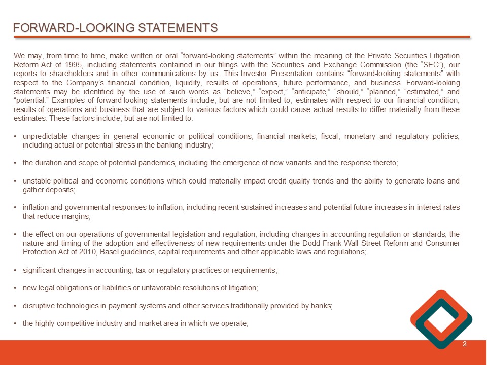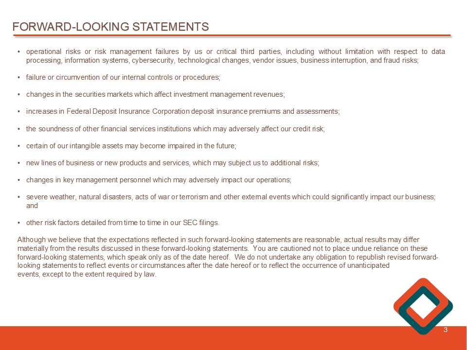 FORWARD - LOOKING STATEMENTS 2 We may, from time to time, make written or oral “forward - looking statements” within the meaning of the Private Securities Litigation Reform Act of 1995 , including statements contained in our filings with the Securities and Exchange Commission (the “SEC”), our reports to shareholders and in other communications by us . This Investor Presentation contains “forward - looking statements” with respect to the Company’s financial condition, liquidity , results of operations, future performance, and business . Forward - looking statements may be identified by the use of such words as “believe,” “expect,” “anticipate ,” “ should,” “planned,” “estimated,” and “potential . ” Examples of forward - looking statements include, but are not limited to, estimates with respect to our financial condition, results of operations and business that are subject to various factors which could cause actual results to differ materially from these estimates . These factors include, but are not limited to : • unpredictable changes in general economic or political conditions , financial markets, fiscal, monetary and regulatory policies, including actual or potential stress in the banking industry ; • the duration and scope of potential pandemics, including the emergence of new variants and the response thereto ; • unstable political and economic conditions which could materially impact credit quality trends and the ability to generate loans and gather deposits ; • inflation and governmental responses to inflation, including recent sustained increases and potential future increases in interest rates that reduce margins ; • the effect on our operations of governmental legislation and regulation, including changes in accounting regulation or standards, the nature and timing of the adoption and effectiveness of new requirements under the Dodd - Frank Wall Street Reform and Consumer Protection Act of 2010 , Basel guidelines, capital requirements and other applicable laws and regulations ; • significant changes in accounting, tax or regulatory practices or requirements ; • new legal obligations or liabilities or unfavorable resolutions of litigation ; • disruptive technologies in payment systems and other services traditionally provided by banks ; • the highly competitive industry and market area in which we operate ;