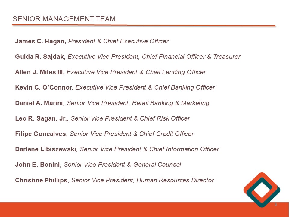 SENIOR MANAGEMENT TEAM James C . Hagan, President & Chief Executive Officer Guida R . Sajdak, Executive Vice President, Chief Financial Officer & Treasurer Allen J . Miles III, Executive Vice President & Chief Lending Officer Kevin C . O’Connor, Executive Vice President & Chief Banking Officer Daniel A . Marini , Senior Vice President, Retail Banking & Marketing Leo R . Sagan, Jr . , Senior Vice President & Chief Risk Officer Filipe Goncalves, Senior Vice President & Chief Credit Officer Darlene Libiszewski , Senior Vice President & Chief Information Officer John E . Bonini , Senior Vice President & General Counsel Christine Phillips , Senior Vice President, Human Resources Director 5