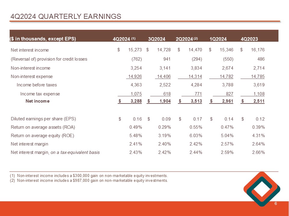 4 Q2024 QUARTERLY EARNINGS 6 4Q2023 1Q2024 2Q2024 (2) 3Q2024 4Q2024 (1) ($ in thousands , except EPS ) $ 16,176 $ 15,346 $ 14,470 $ 14,728 $ 15,273 Net interest income 486 (550) (294) 941 (762) (Reversal of) provision for credit losses 2,714 2,674 3,834 3,141 3,254 Non - interest income 14,785 14,782 14,314 14,406 14,926 Non - interest expense 3,619 3,788 4,284 2,522 4,363 Income before taxes 1,108 827 771 618 1,075 Income tax expense $ 2,511 $ 2,961 $ 3,513 $ 1,904 $ 3,288 Net income $ 0.12 $ 0.14 $ 0.17 $ 0.09 $ 0.16 Diluted earnings per share (EPS) 0.39% 0.47% 0.55% 0.29% 0.49% Return on average assets (ROA) 4.31% 5.04% 6.03% 3.19% 5.48% Return on average equity (ROE) 2.64% 2.57% 2.42% 2.40% 2.41% Net interest margin 2.66% 2.59% 2.44% 2.42% 2.43% Net interest margin, on a tax - equivalent basis (1) Non - interest income includes a $300,000 gain on non - marketable equity investments. (2) Non - interest income includes a $987,000 gain on non - marketable equity investments.
