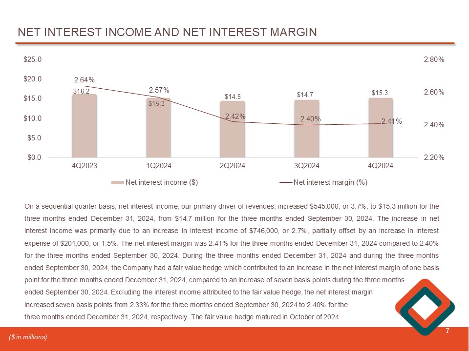 NET INTEREST INCOME AND NET INTEREST MARGIN 7 $16.2 $15.3 $14.5 $14.7 $15.3 2.64% 2.57% 2.42% 2.40% 2.41% 2.20% 2.40% 2.60% 2.80% 4Q2023 1Q2024 2Q2024 3Q2024 4Q2024 $0.0 $5.0 $10.0 $15.0 $20.0 $25.0 Net interest income ($) Net interest margin (%) On a sequential quarter basis, net interest income, our primary driver of revenues, increased $ 545 , 000 , or 3 . 7 % , to $ 15 . 3 million for the three months ended December 31 , 2024 , from $ 14 . 7 million for the three months ended September 30 , 2024 . The increase in net interest income was primarily due to an increase in interest income of $ 746 , 000 , or 2 . 7 % , partially offset by an increase in interest expense of $ 201 , 000 , or 1 . 5 % . The net interest margin was 2 . 41 % for the three months ended December 31 , 2024 compared to 2 . 40 % for the three months ended September 30 , 2024 . During the three months ended December 31 , 2024 and during the three months ended September 30 , 2024 , the Company had a fair value hedge which contributed to an increase in the net interest margin of one basis point for the three months ended December 31 , 2024 , compared to an increase of seven basis points during the three months ended September 30 , 2024 . Excluding the interest income attributed to the fair value hedge, the net interest margin increased seven basis points from 2 . 33 % for the three months ended September 30 , 2024 to 2 . 40 % for the three months ended December 31 , 2024 , respectively . The fair value hedge matured in October of 2024 . ($ in millions)