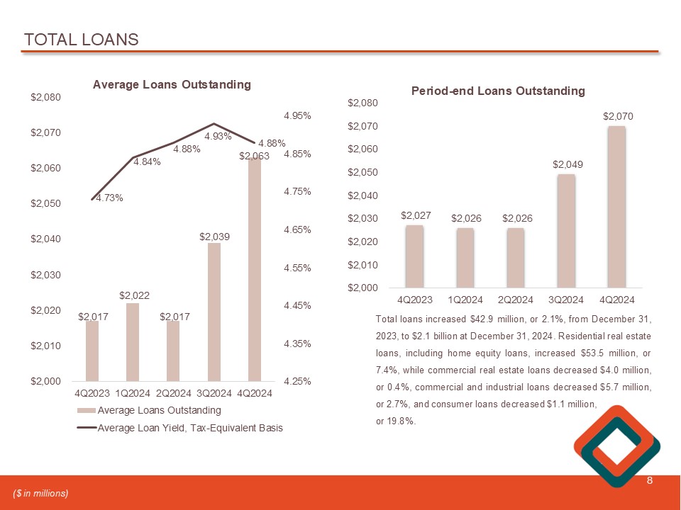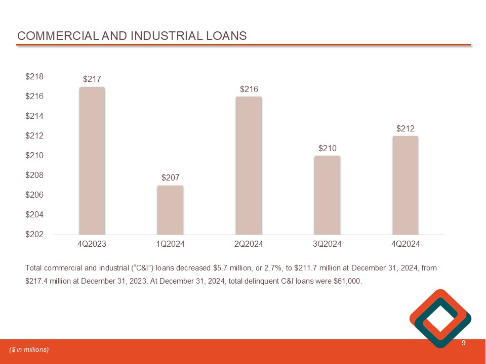 TOTAL LOANS 8 $2,017 $2,022 $2,017 $2,039 $2,063 4.73% 4.84% 4.88% 4.93% 4.88% 4.25% 4.35% 4.45% 4.55% 4.65% 4.75% 4.85% 4.95% 4Q2023 1Q2024 2Q2024 3Q2024 4Q2024 $2,000 $2,010 $2,020 $2,030 $2,040 $2,050 $2,060 $2,070 $2,080 Average Loans Outstanding Average Loans Outstanding Average Loan Yield, Tax-Equivalent Basis $2,027 $2,026 $2,026 $2,049 $2,070 4Q2023 1Q2024 2Q2024 3Q2024 4Q2024 $2,000 $2,010 $2,020 $2,030 $2,040 $2,050 $2,060 $2,070 $2,080 Period - end Loans Outstanding Total loans increased $ 42 . 9 million, or 2 . 1 % , from December 31 , 2023 , to $ 2 . 1 billion at December 31 , 2024 . Residential real estate loans, including home equity loans , increased $ 53 . 5 million, or 7 . 4 % , while commercial real estate loans decreased $ 4 . 0 million, or 0 . 4 % , commercial and industrial loans decreased $ 5 . 7 million, or 2 . 7 % , and consumer loans decreased $ 1 . 1 million, or 19 . 8 % . ($ in millions)
