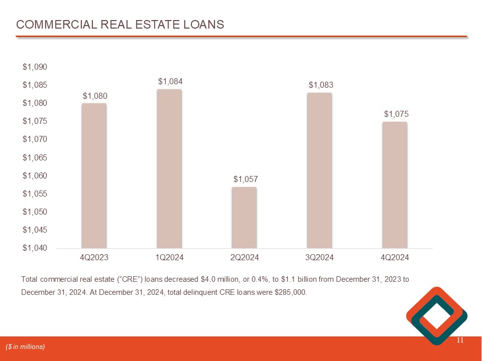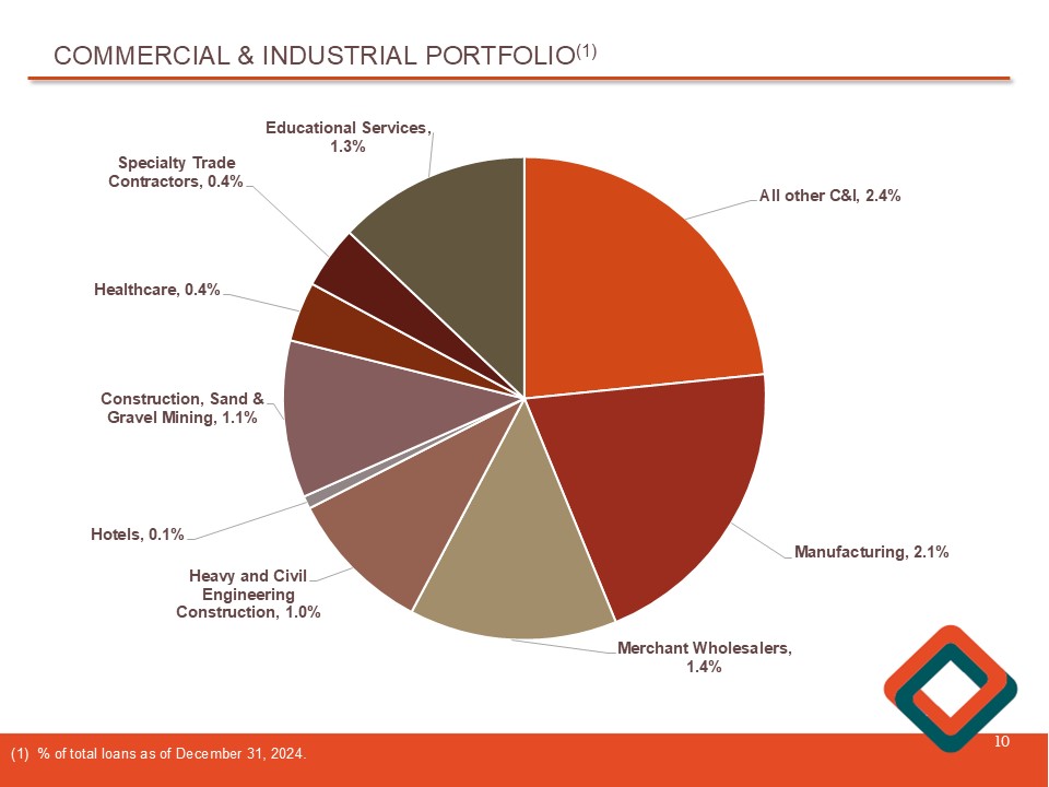 COMMERCIAL AND INDUSTRIAL LOANS 9 $217 $207 $216 $210 $212 4Q2023 1Q2024 2Q2024 3Q2024 4Q2024 $202 $204 $206 $208 $210 $212 $214 $216 $218 Total commercial and industrial (“C&I”) loans decreased $ 5 . 7 million, or 2 . 7 % , to $ 211 . 7 million at December 31 , 2024 , from $ 217 . 4 million at December 31 , 2023 . At December 31 , 2024 , total delinquent C&I loans were $ 61 , 000 . ($ in millions)