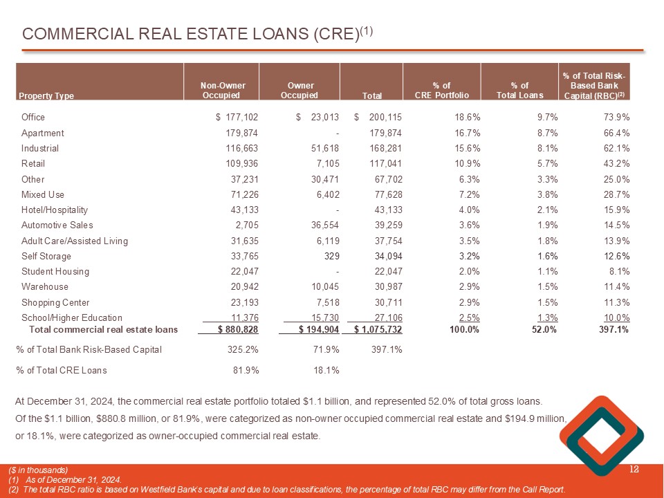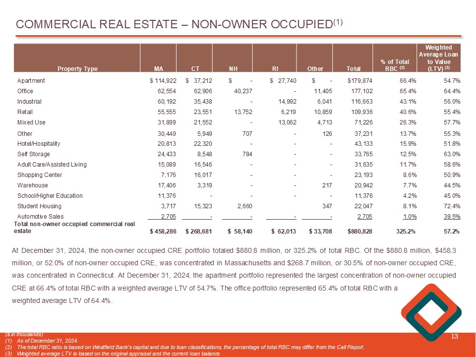 COMMERCIAL REAL ESTATE LOANS (CRE) (1) 12 ($ in thousands) (1) As of December 31, 2024. (2) The total RBC ratio is based on Westfield Bank’s capital and due to loan classifications, the percentage of total RBC ma y d iffer from the Call Report. At December 31 , 2024 , the commercial real estate portfolio totaled $ 1 . 1 billion, and represented 52 . 0 % of total gross loans . Of the $ 1 . 1 billion, $ 880 . 8 million, or 81 . 9 % , were categorized as non - owner occupied commercial real estate and $ 194 . 9 million , or 18 . 1 % , were categorized as owner - occupied commercial real estate . % of Total Risk - Based Bank Capital (RBC) (2) % of Total Loans % of CRE Portfolio Total Owner Occupied Non - Owner Occupied Property Type 73.9% 9.7% 18.6% $ 200,115 $ 23,013 $ 177,102 Office 66.4% 8.7% 16.7% 179,874 - 179,874 Apartment 62.1% 8.1% 15.6% 168,281 51,618 116,663 Industrial 43.2% 5.7% 10.9% 117,041 7,105 109,936 Retail 25.0% 3.3% 6.3% 67,702 30,471 37,231 Other 28.7% 3.8% 7.2% 77,628 6,402 71,226 Mixed Use 15.9% 2.1% 4.0% 43,133 - 43,133 Hotel/Hospitality 14.5% 1.9% 3.6% 39,259 36,554 2,705 Automotive Sales 13.9% 1.8% 3.5% 37,754 6,119 31,635 Adult Care/Assisted Living 12.6% 1.6% 3.2% 34,094 329 33,765 Self Storage 8.1% 1.1% 2.0% 22,047 - 22,047 Student Housing 11.4% 1.5% 2.9% 30,987 10,045 20,942 Warehouse 11.3% 1.5% 2.9% 30,711 7,518 23,193 Shopping Center 10.0% 1.3% 2.5% 27,106 15,730 11,376 School/Higher Education 397.1% 52.0% 100.0% $ 1,075,732 $ 194,904 $ 880,828 Total commercial real estate loans 397.1% 71.9% 325.2% % of Total Bank Risk - Based Capital 18.1% 81.9% % of Total CRE Loans