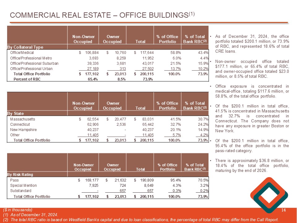 COMMERCIAL REAL ESTATE – NON - OWNER OCCUPIED (1) 13 At December 31 , 2024 , the non - owner occupied CRE portfolio totaled $ 880 . 8 million, or 325 . 2 % of total RBC . Of the $ 880 . 8 million, $ 458 . 3 million , or 52 . 0 % of non - owner occupied CRE, was concentrated in Massachusetts and $ 268 . 7 million, or 30 . 5 % of non - owner occupied CRE, was concentrated in Connecticut . At December 31 , 2024 , the apartment portfolio represented the largest concentration of non - owner occupied CRE at 66 . 4 % of t otal RBC with a weighted average LTV of 54 . 7 % . The office portfolio represented 65 . 4 % of total RBC with a weighted average LTV of 64 . 4 % . ($ in thousands) (1) As of December 31, 2024. (2) The total RBC ratio is based on Westfield Bank’s capital and due to loan classifications, the percentage of total RBC may differ fro m the Call Report . (3) Weighted average LTV is based on the original appraisal and the current loan balance. Weighted Average Loan to Value (LTV) (3) % of Total RBC (2) Total Other RI NH CT MA Property Type 54.7% 66.4% $179,874 $ - $ 27,740 $ - $ 37,212 $ 114,922 Apartment 64.4% 65.4% 177,102 11,405 - 40,237 62,906 62,554 Office 56.0% 43.1% 116,663 6,041 14,992 - 35,438 60,192 Industrial 55.4% 40.6% 109,936 10,859 6,219 13,752 23,551 55,555 Retail 57.7% 26.3% 71,226 4,713 13,062 - 21,552 31,899 Mixed Use 55.3% 13.7% 37,231 126 - 707 5,949 30,449 Other 51.8% 15.9% 43,133 - - - 22,320 20,813 Hotel/Hospitality 63.0% 12.5% 33,765 - - 784 8,548 24,433 Self Storage 58.6% 11.7% 31,635 - - - 16,546 15,089 Adult Care/Assisted Living 50.9% 8.6% 23,193 - - - 16,017 7,176 Shopping Center 44.5% 7.7% 20,942 217 - - 3,319 17,406 Warehouse 45.0% 4.2% 11,376 - - - - 11,376 School/Higher Education 72.4% 8.1% 22,047 347 2,660 15,323 3,717 Student Housing 39.5% 1.0% 2,705 - - - - 2,705 Automotive Sales 57.2% 325.2% $880,828 $ 33,708 $ 62,013 $ 58,140 $ 268,681 $ 458,286 Total non - owner occupied commercial real estate