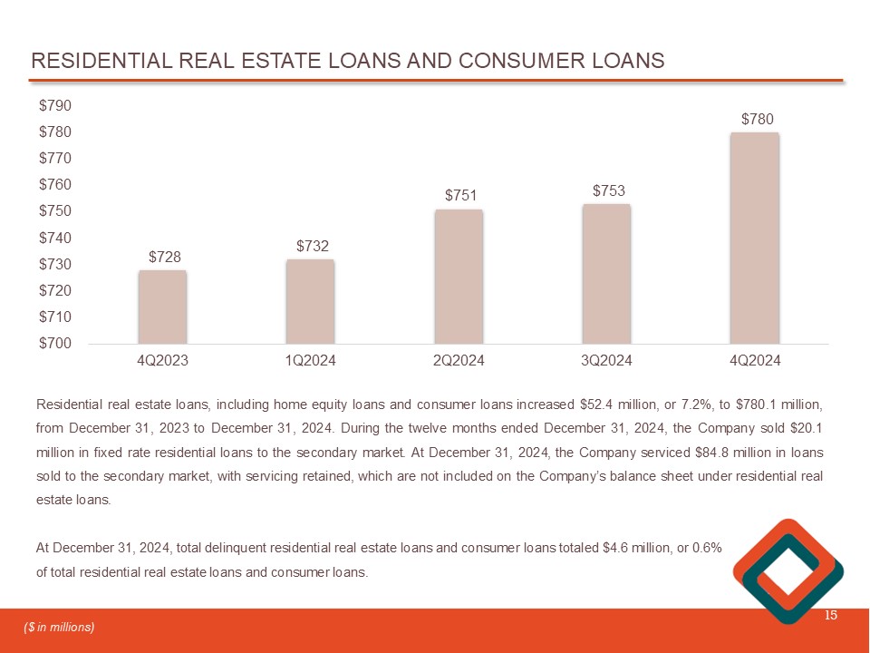 RESIDENTIAL REAL ESTATE LOANS AND CONSUMER LOANS 15 $728 $732 $751 $753 $780 4Q2023 1Q2024 2Q2024 3Q2024 4Q2024 $700 $710 $720 $730 $740 $750 $760 $770 $780 $790 Residential real estate loans , including home equity loans and consumer loans increased $ 52 . 4 million , or 7 . 2 % , to $ 780 . 1 million, from December 31 , 2023 to December 31 , 2024 . During the twelve months ended December 31 , 2024 , the Company sold $ 20 . 1 million in fixed rate residential loans to the secondary market . At December 31 , 2024 , the Company serviced $ 84 . 8 million in loans sold to the secondary market, with servicing retained, which are not included on the Company’s balance sheet under residential real estate loans . At December 31 , 2024 , total delinquent residential real estate loans and consumer loans totaled $ 4 . 6 million, or 0 . 6 % of total residential real estate loans and consumer loans . ($ in millions)