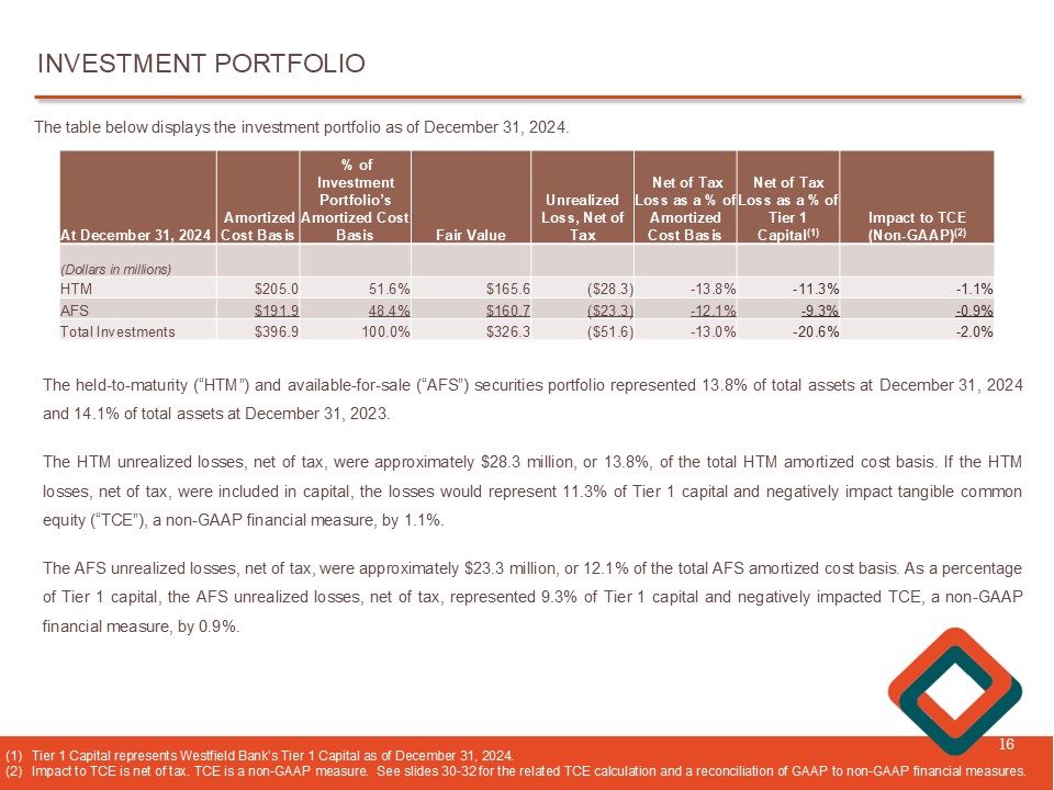INVESTMENT PORTFOLIO 16 The held - to - maturity (“HTM”) and available - for - sale (“AFS”) securities portfolio represented 13 . 8 % of total assets at December 31 , 2024 and 14 . 1 % of total assets at December 31 , 2023 . The HTM unrealized losses, net of tax, were approximately $ 28 . 3 million, or 13 . 8 % , of the total HTM amortized cost basis . If the HTM losses, net of tax, were included in capital, the losses would represent 11 . 3 % of Tier 1 capital and negatively impact tangible common equity (“TCE”), a non - GAAP financial measure, by 1 . 1 % . The AFS unrealized losses, net of tax, were approximately $ 23 . 3 million , or 12 . 1 % of the total AFS amortized cost basis . As a percentage of Tier 1 capital, the AFS unrealized losses, net of tax, represented 9 . 3 % of Tier 1 capital and negatively impacted TCE, a non - GAAP financial measure, by 0 . 9 % . (1) Tier 1 Capital represents Westfield Bank’s Tier 1 Capital as of December 31, 2024. (2) Impact to TCE is net of tax. TCE is a non - GAAP measure. See slides 30 - 32 for the related TCE calculation and a reconciliation of GAAP to non - GAAP financial measures . The table below displays the investment portfolio as of December 31 , 2024 . Impact to TCE ( Non - GAAP) (2) Net of Tax Loss as a % of Tier 1 Capital (1) Net of Tax Loss as a % of Amortized Cost Basis Unrealized Loss, Net of Tax Fair Value % of Investment Portfolio’s Amortized Cost Basis Amortized Cost Basis At December 31, 2024 (Dollars in millions) - 1.1% - 11.3% - 13.8% ($28.3) $ 165.6 51.6% $ 205.0 HTM - 0.9% - 9.3% - 12.1% ($23.3) $ 160.7 48.4% $ 191.9 AFS - 2.0% - 20.6% - 13.0% ($ 51.6) $ 326.3 100.0% $ 396.9 Total Investments