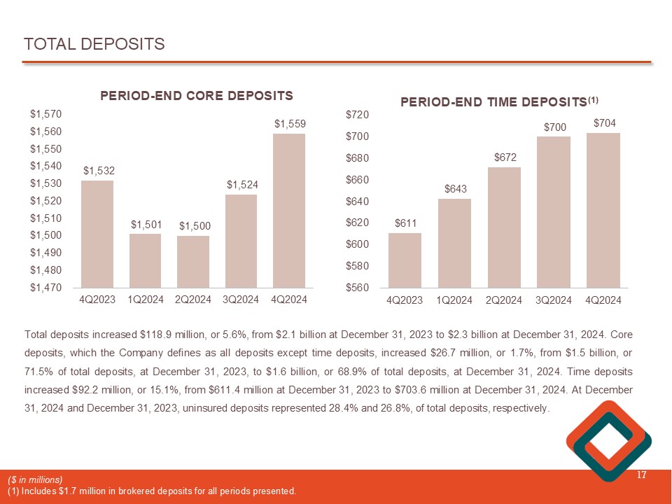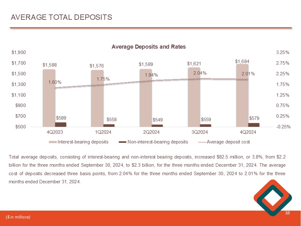 TOTAL DEPOSITS 17 $1,532 $1,501 $1,500 $1,524 $1,559 4Q2023 1Q2024 2Q2024 3Q2024 4Q2024 $1,470 $1,480 $1,490 $1,500 $1,510 $1,520 $1,530 $1,540 $1,550 $1,560 $1,570 PERIOD - END CORE DEPOSITS Total deposits increased $ 118 . 9 million, or 5 . 6 % , from $ 2 . 1 billion at December 31 , 2023 to $ 2 . 3 billion at December 31 , 2024 . Core deposits, which the Company defines as all deposits except time deposits, increased $ 26 . 7 million, or 1 . 7 % , from $ 1 . 5 billion, or 71 . 5 % of total deposits, at December 31 , 2023 , to $ 1 . 6 billion, or 68 . 9 % of total deposits, at December 31 , 2024 . Time deposits increased $ 92 . 2 million, or 15 . 1 % , from $ 611 . 4 million at December 31 , 2023 to $ 703 . 6 million at December 31 , 2024 . At December 31 , 2 024 and December 31 , 2023 , uninsured deposits represented 28 . 4 % and 26 . 8 % , of total deposits, respectively . $611 $643 $672 $700 $704 4Q2023 1Q2024 2Q2024 3Q2024 4Q2024 $560 $580 $600 $620 $640 $660 $680 $700 $720 PERIOD - END TIME DEPOSITS (1) ($ in millions) (1) Includes $1.7 million in brokered deposits for all periods presented.